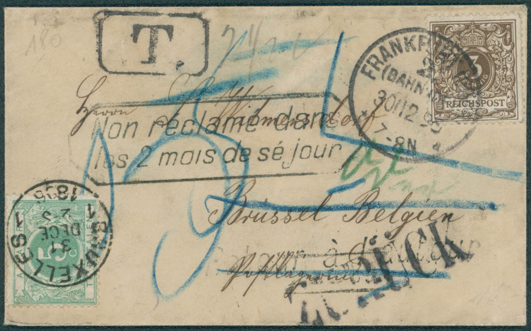 Allemagne Yv. 45 obl Frankfurt 30/12/95 sur imprimé vers Bruxelles. 'Non réclamé dans/les 2 mois de séjour'. Taxe belge 5c par Tx 3 et Zurück. Verso : Ostende-Verviers 2/3, Bruxelles et retour Frankfurt 5/3/97.'