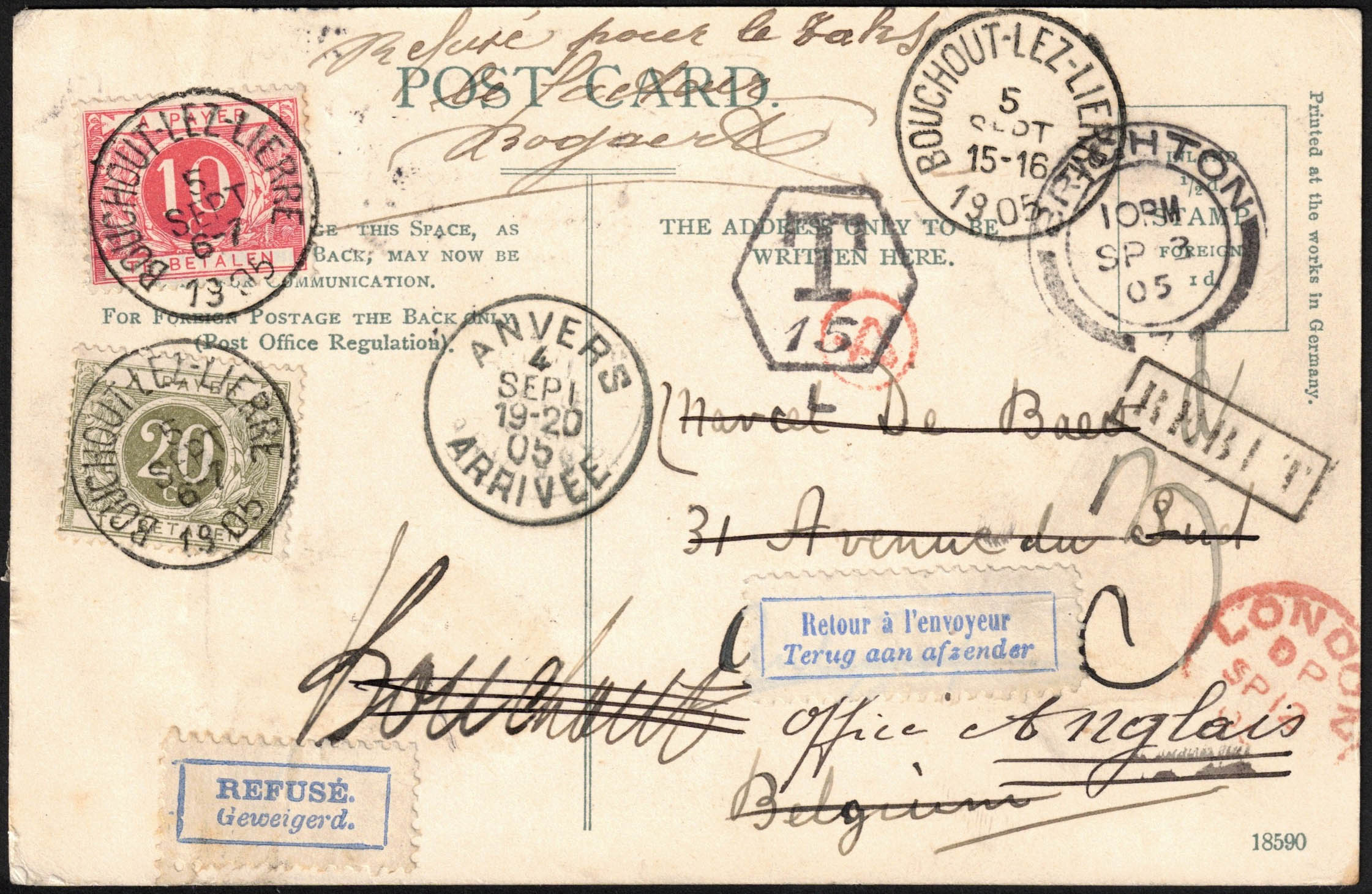 GB 2x1/2p au recto obl Brighton 3/9/05 sur CP vers la Belgique. Taxe belge 30c par Tx 5-6 obl Bouchout-Lez-Lierre 5/9/05. Refusé pour la taxe. Etiquettes 'Refusé', 'Retour à l'envoyeur' et 'Rebut'. Retour Londres 12/9.'