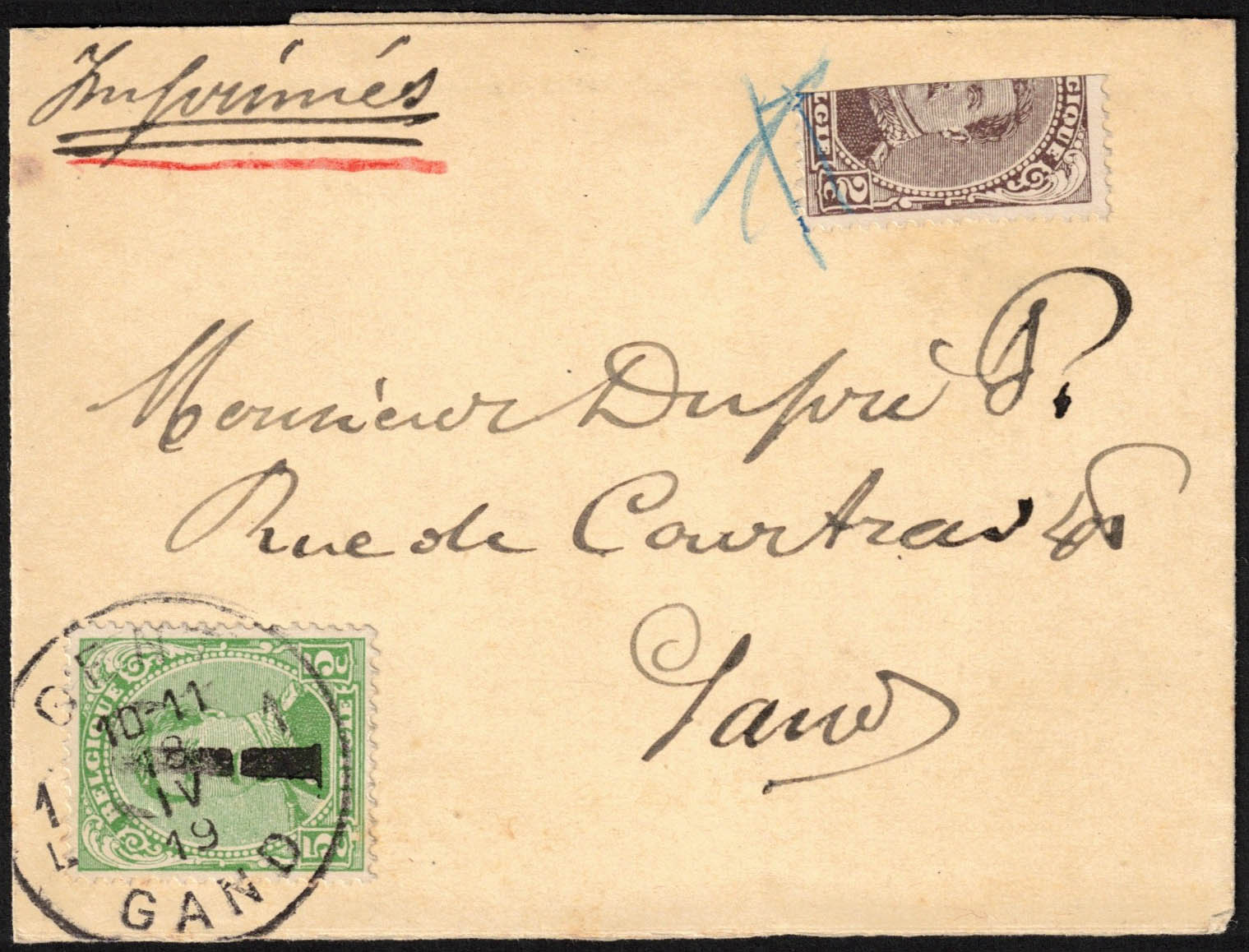 136, 1/2 timbre annulé au crayon bleu sur bande d'imprimé de et vers Gand. Taxe 5c par Tx 17. TB