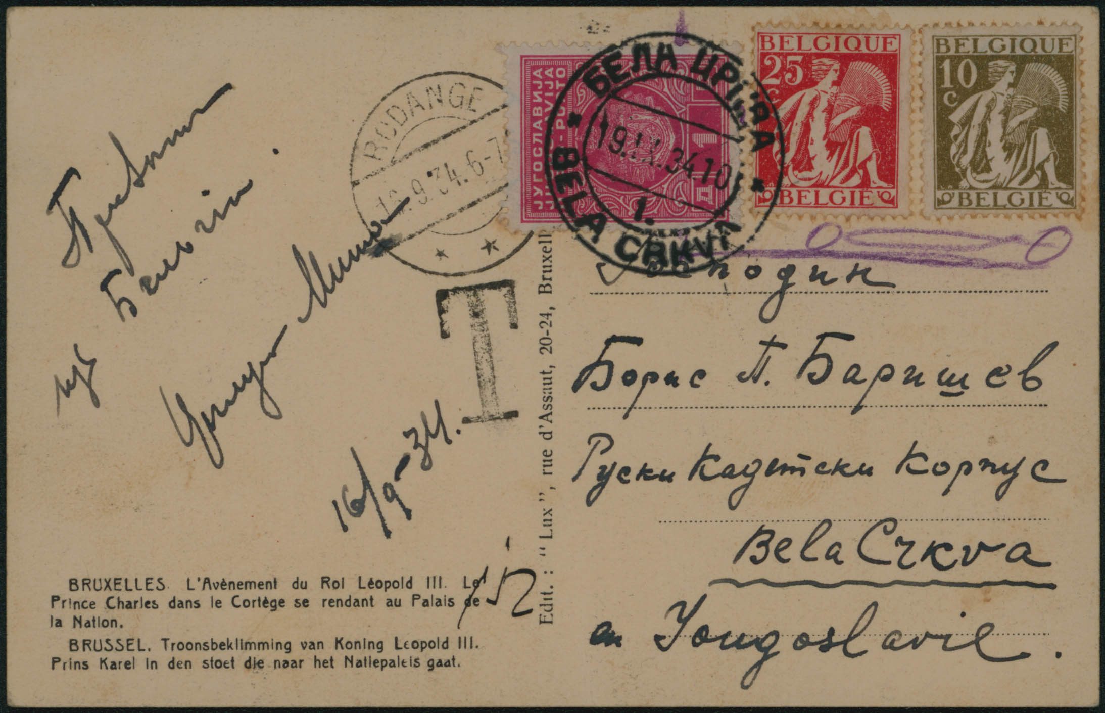 337-339 utilisés à Rodange 19/9/34 (G.D. Luxembourg), afft refusé et taxé sur CP vers Bela Crkva, Yougoslavie. Taxe à l'arrivée par Yv. Tx 79. TB