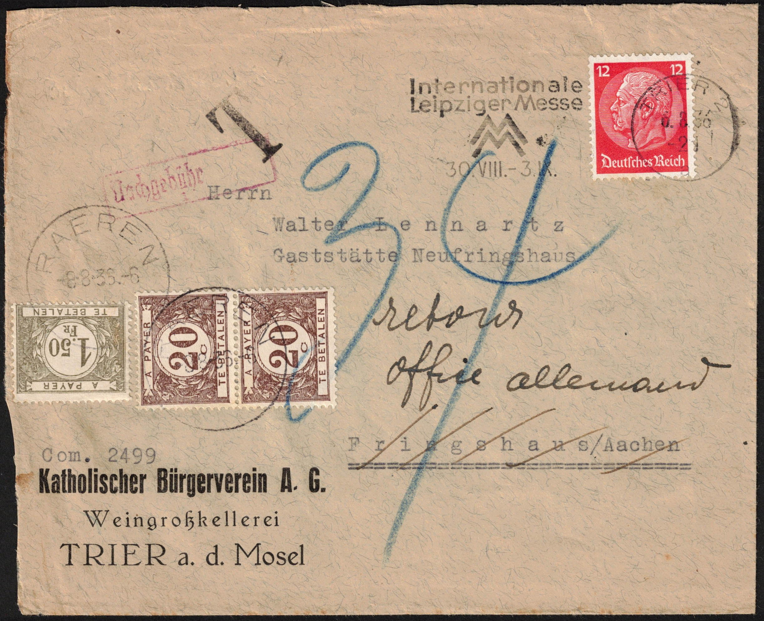 Allemagne Yv. 449 (12pf) obl Trier vers Fringshaus. Taxée 1,90F à Raeren (cantons de l'Est) par Tx 34x2-46. Verso étiquette bilingue 'Refusé pour la taxe' et manuscrit au recto 'Retour office allemand'. TB'