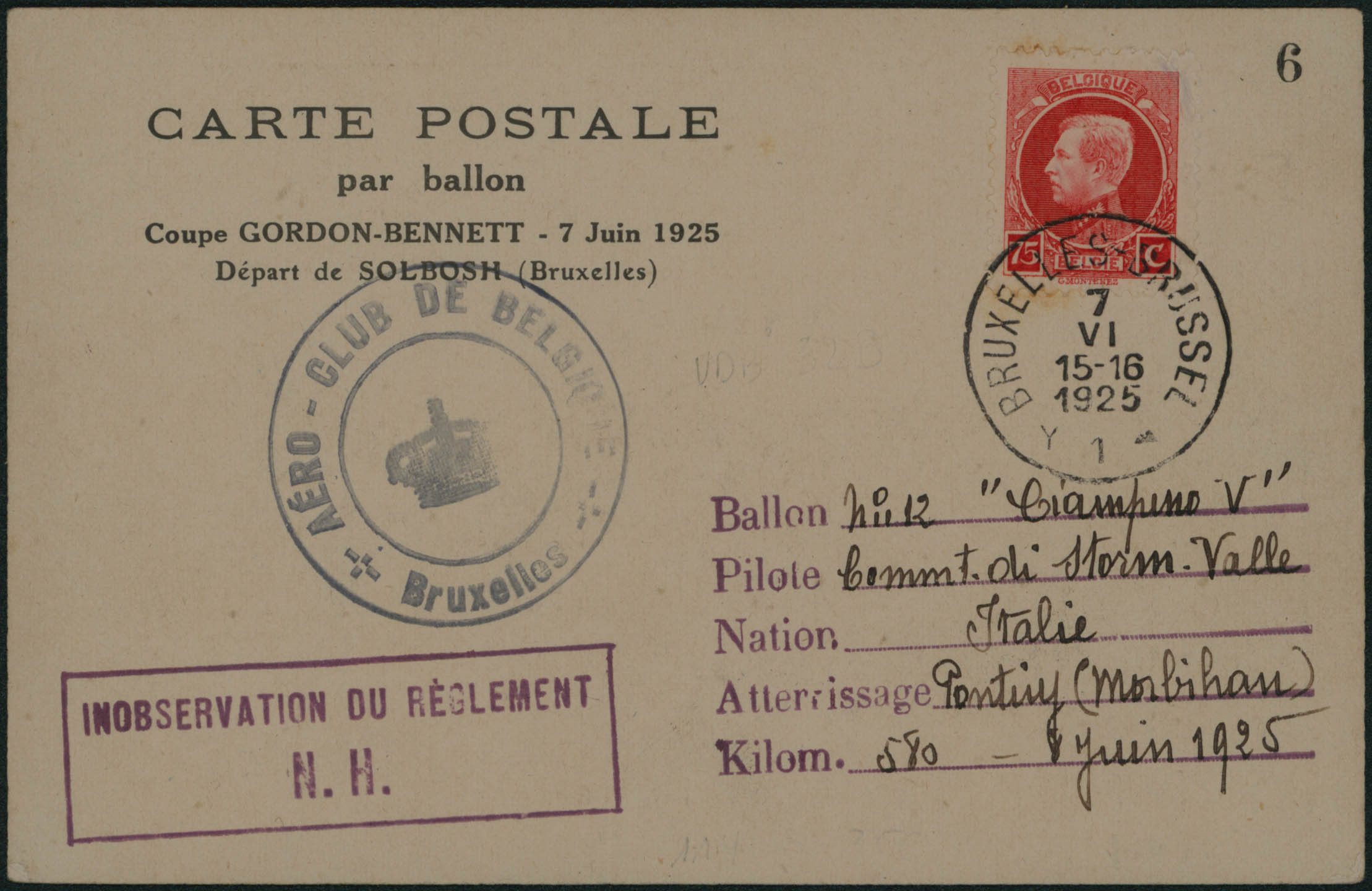 212 obl Bruxelles 7/6/25 sur CP par ballon Groupe Gordon Bennett 7 juin 1929 - Ballon N° 12 Ciampino V / Pilote Cdt di Storm-Valle Italie - distance parcourue 580 km.