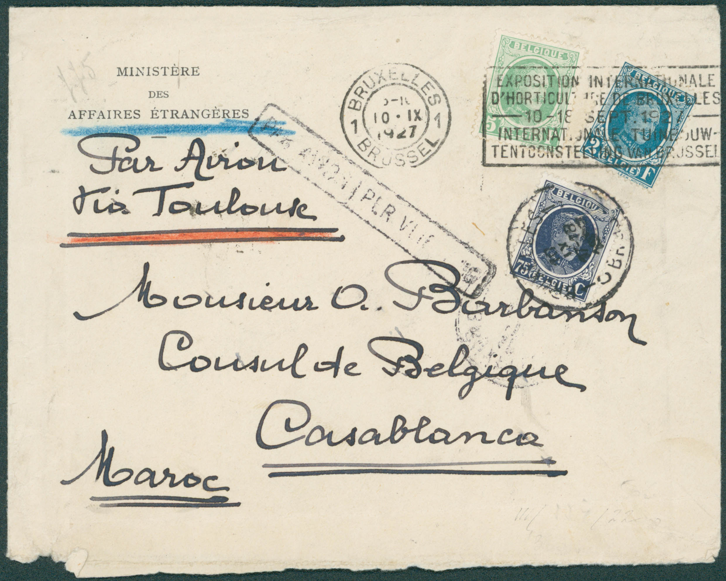 204-208/9 obl Bruxelles 10/9/27, griffe bilingue 'Par Avion/Per Vliegtuig', via Toulouse vers Casablanca, Maroc. Càd arrivée verso 13/9/27.'