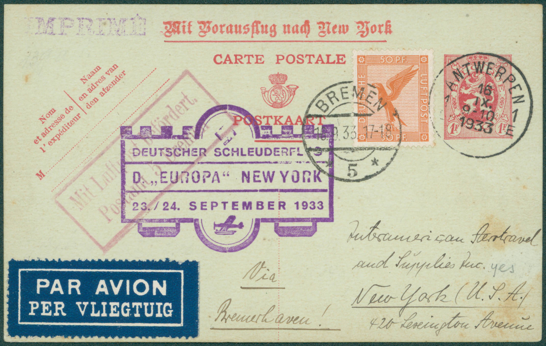 EP 1F obl Antwerpen 18/9/1933 + Allemagne Yv. PA 31 obl Bremen 18/9 vers New-York. Deutscher Schleuderfleug D 'Europa' New-York 23/24 septembre 1933.'