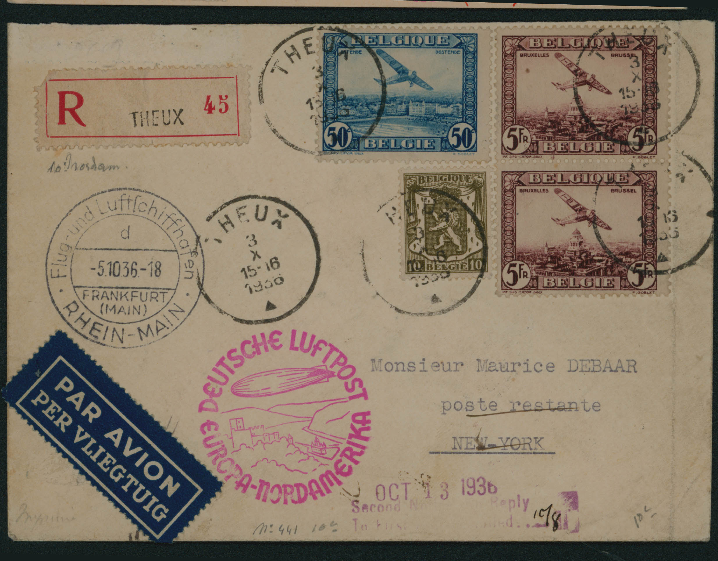 420-PA 1-4x2 obl Theux 3/10/1936 via Deutsche Luftpost, càd Frankfurt 5/10/1936, vers New-York, càd verso 8/10. Non réclamé et retour.