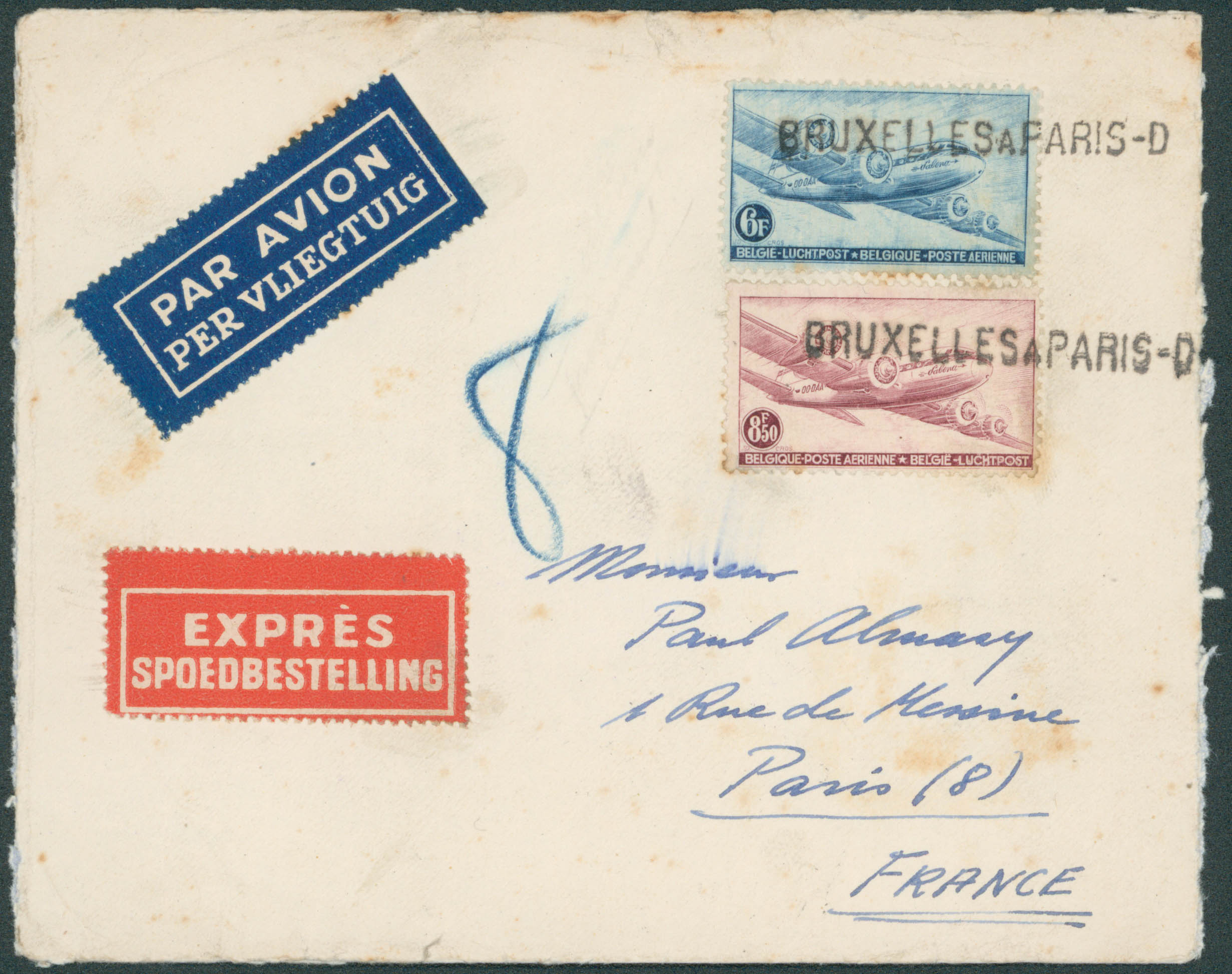 PA 8/9 annulés par griffe 'Bruxelles A Paris-D' en expres vers Paris, càd verso.'
