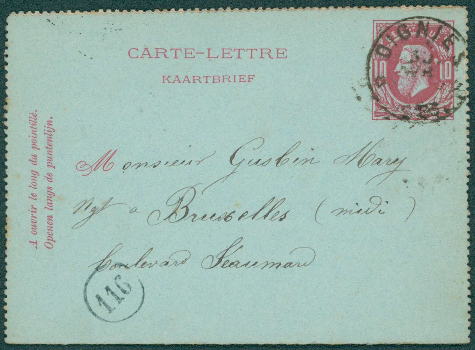 CL 10c obl relais Oignies 30/4/83 vers Bruxelles, càd verso. Texte à l'intérieur. R