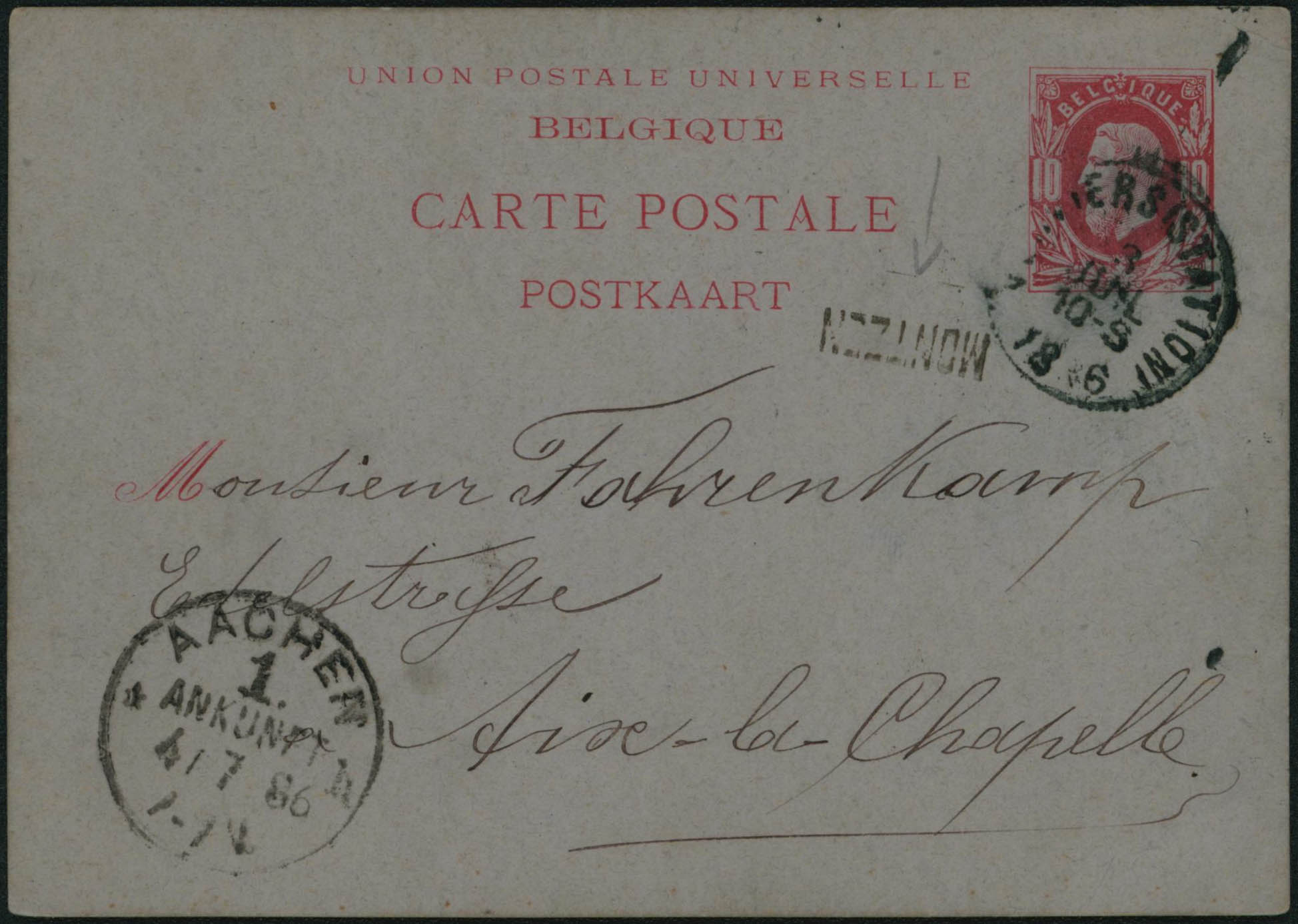 EP 10c obl Verviers(Station) 3/7/1886 + griffe linéaire Montzen vers Aix-la-Chapelle, càd arrivée 4/7. Texte au verso.