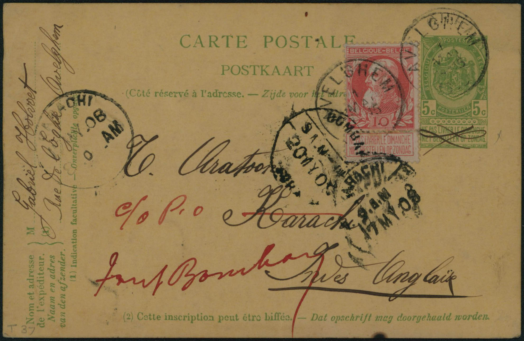 EP 5c + 74 obl Avelghem 1/5/08 vers Karachi, Indes anglaises et suivi Bombay. Texte au verso.
