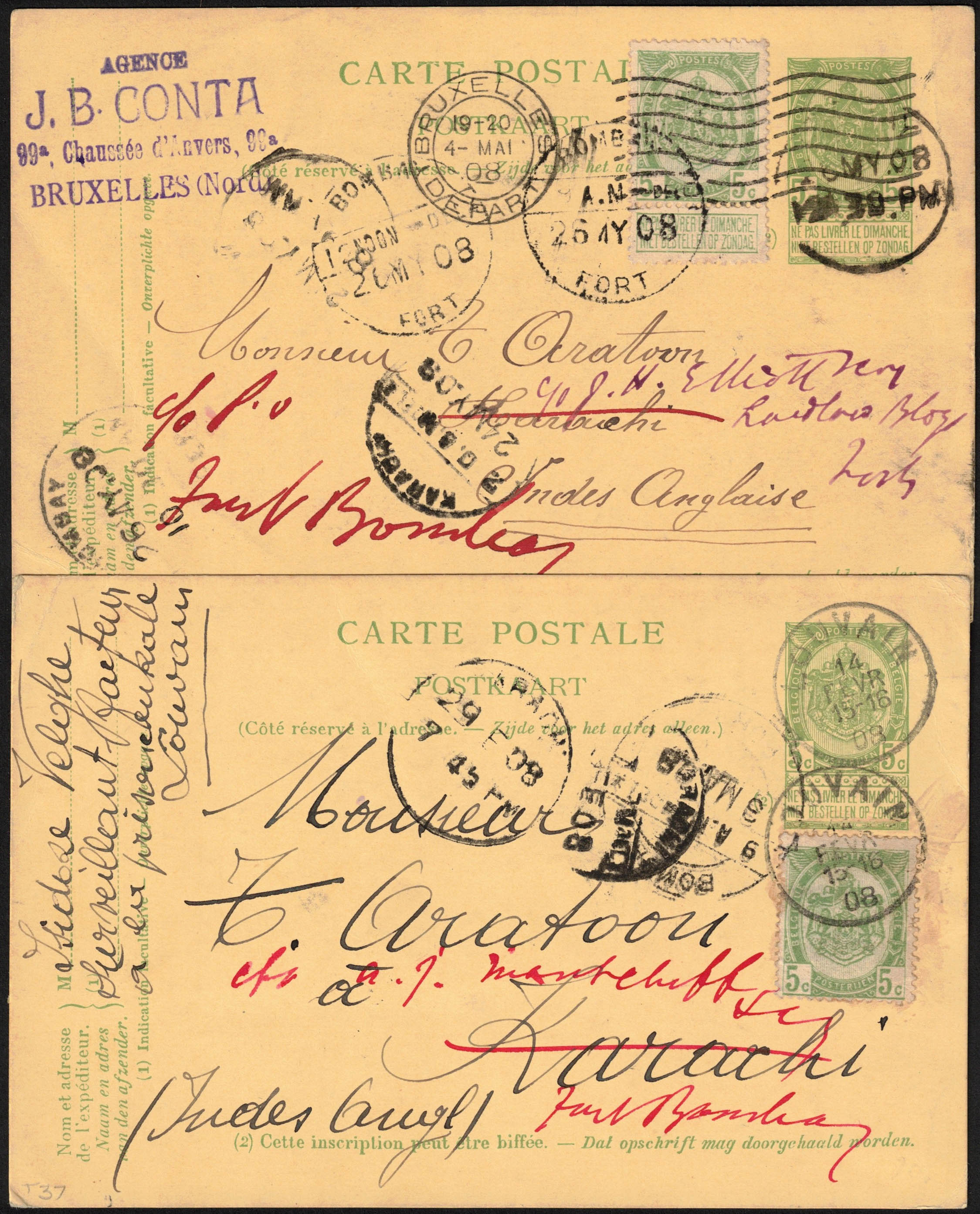 2 EP 5c + 83 obl Louvain 14/2 et 4/5/1908 vers Karachi, Indes anglaises. Textes au verso. Suivis vers Bombay.
