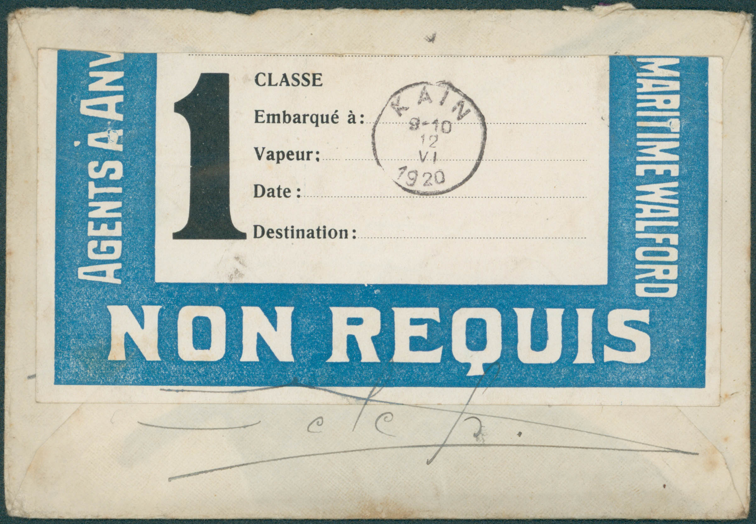 66 bdf obl Boma 15/5/20 vers Kain, Belgique. Au verso càd arrivée sur grande étiquette 'Maritime Walford/Non requis'.'