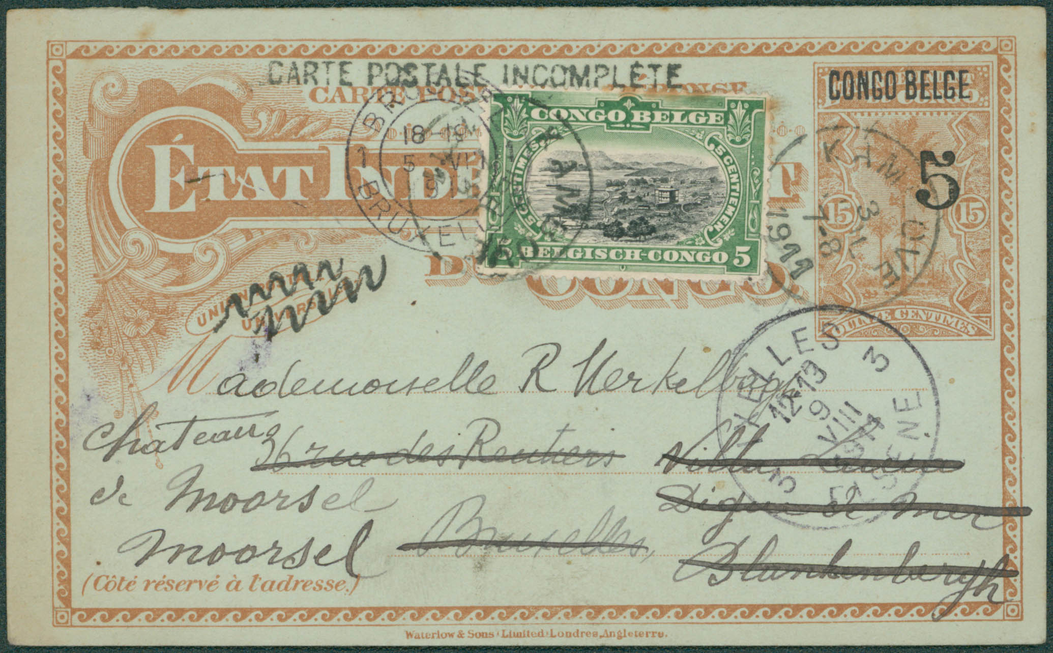 EP 5c (N°31) partie-réponse + 54, griffe en noir 'carte postale incomplète' obl Kambové 3/7/1911 vers Bruxelles, càd 9/8, suivi Blankenberghe et Moorsel. Texte au verso.'