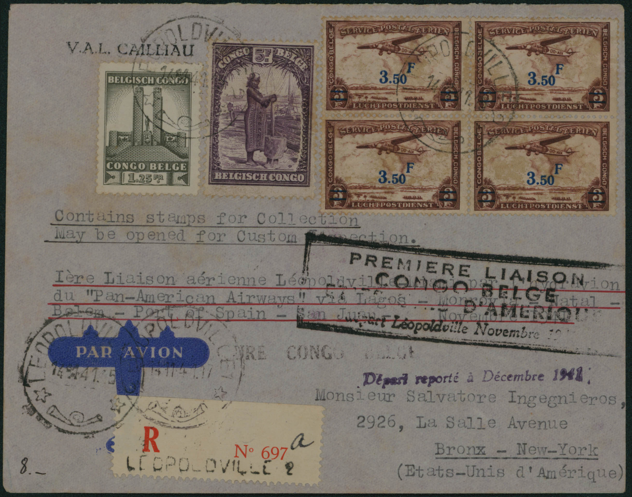 181-219-PA 17 en bloc de 4 obl Léopoldville 14/11/1941 en rec vers New-York. 1ère liaison Congo-Belge Etats-Unis d'Amérique départ Léopoldville Novembre 1941. Départ reporté à Décembre 1941. Censure Congo Belge. Divers càd verso.
