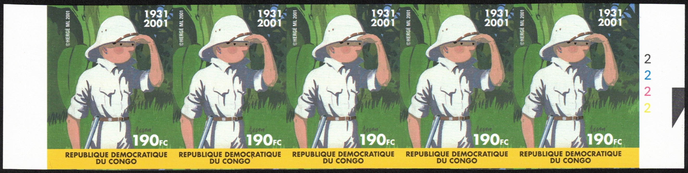 République Démocratique du Congo - 3048 (Tintin) en bande de 5 ND PL 2. Cote 2125?.