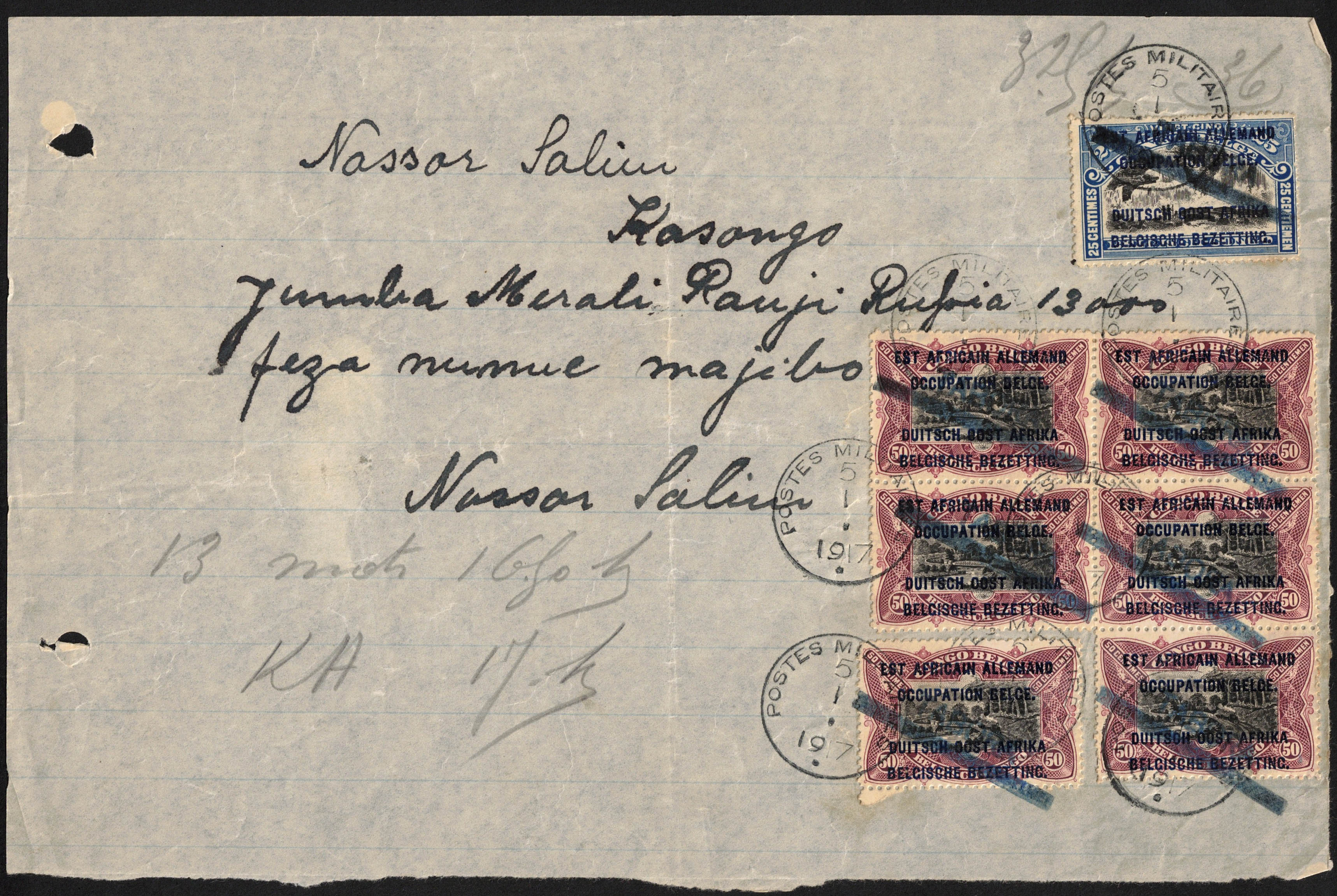 31-33x6 annulés par la griffe noire 'Tabora' soulignée d'un gros trait bleu sur un télégramme vers Kasongo. 13 mots à 25c = 3,25 Frs. Càd Postes Militaires 5/1/17. Rare.'