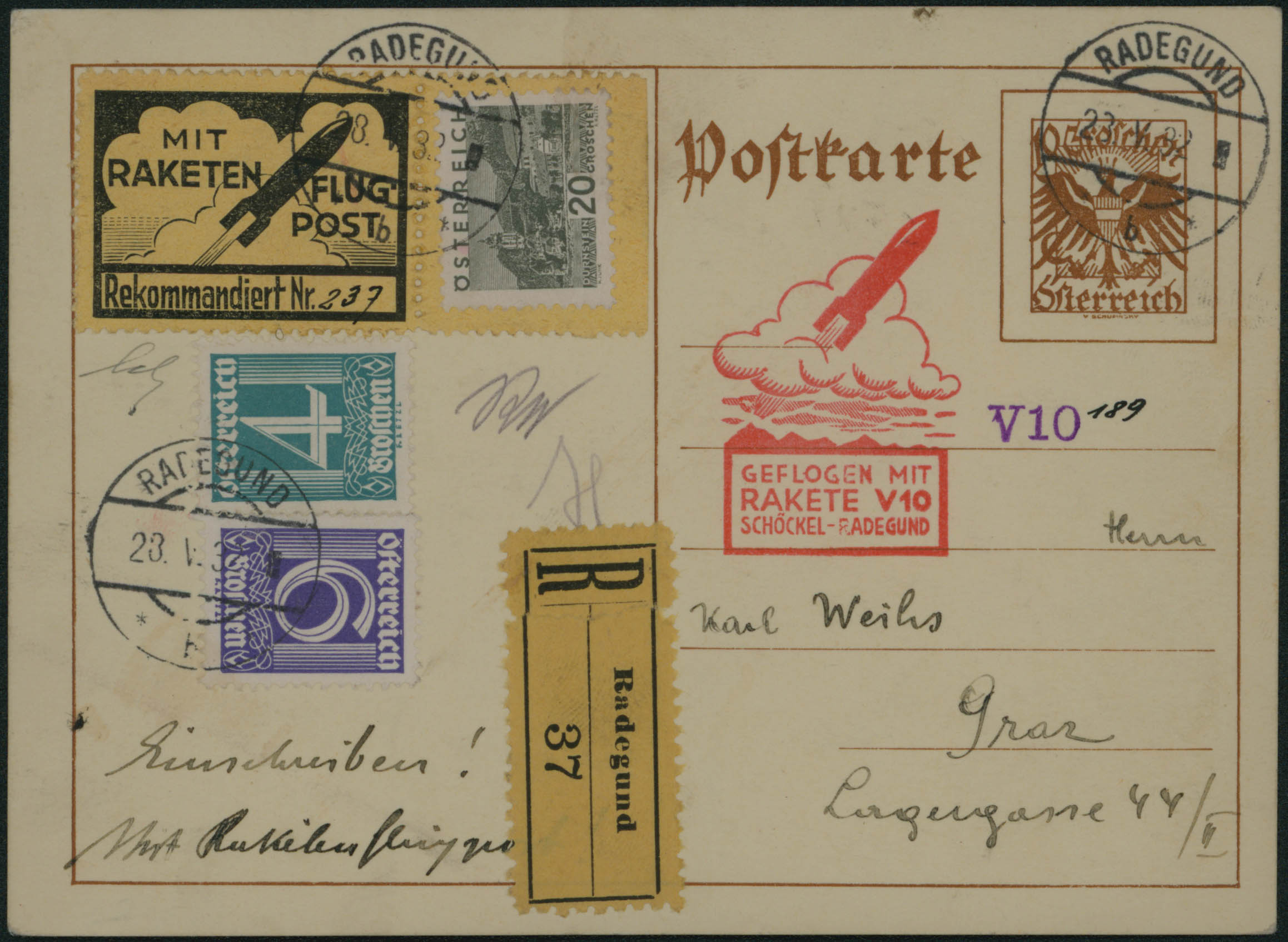 EP 10g + Yv. 282-333A-335 + vignette 'Mit Raketen Flug Post/Rekommandiert' obl Radegund 23/V/37 vers Graz. En rouge 'Geflogen mit/Rakete V 10/Schöckel-Radegund' recto/verso. TB et rare.'