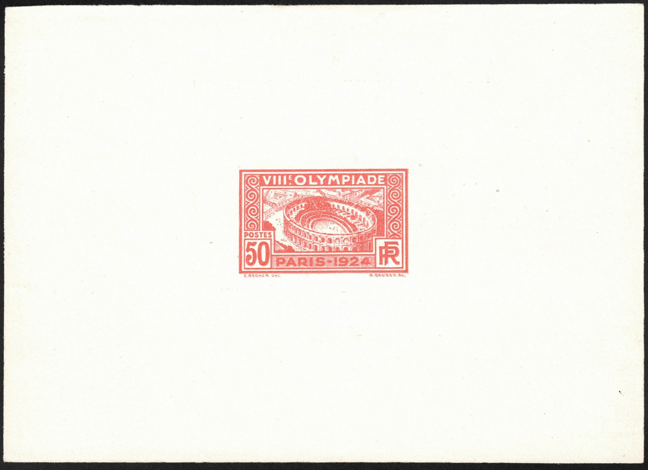 J.O. Paris - Type Yv. 186A - Epreuve de luxe, non émis 'Arênes de Nimes' sur feuillet gommé. Cote 700?. Rare.'