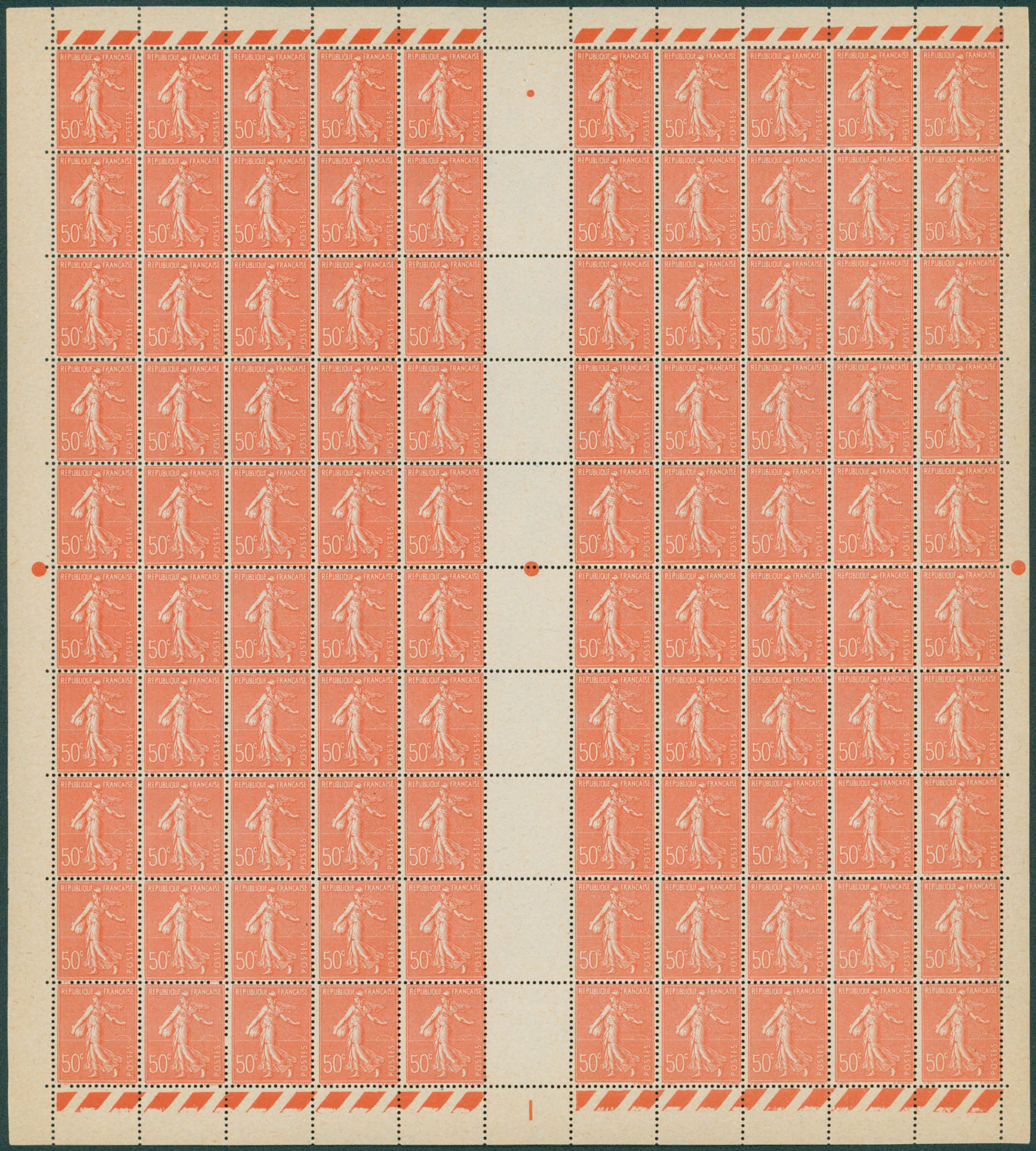 Faux pour tromper la poste - Faux de Marseille, 50c rouge type semeuse camée Yv. 199, en feuille de 100 timbres XX interpanneaux. Cote Yv. 5000?. Au crayon au verso note Calves/Jaquard. Cote 5000?. Certificat photo Roland Pieles. Superbe.