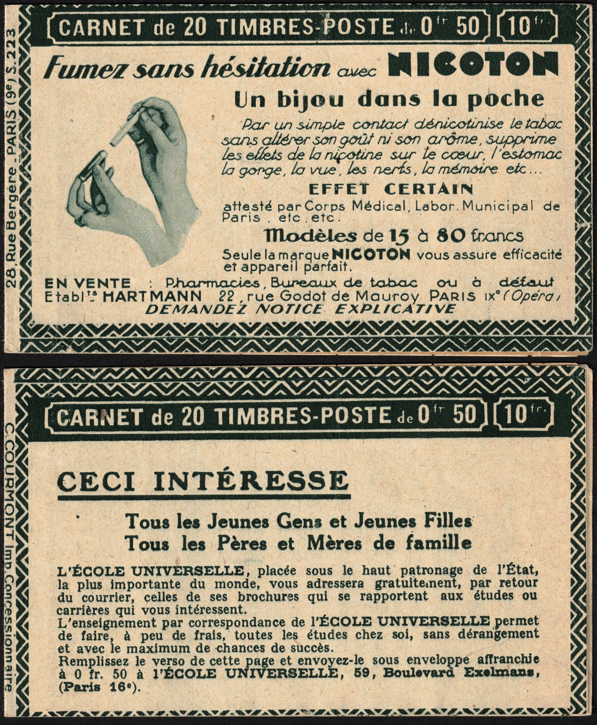 Carnet 272-C1 XX - Série 223B (adhérences) - Nicoton - E.U. - Hartmann - E.U. 502-588 - Type Fachi N° 272b (Type II). Prix 10 frs. 20 t avec publitités (Benjamin x 4). Cote 290?.