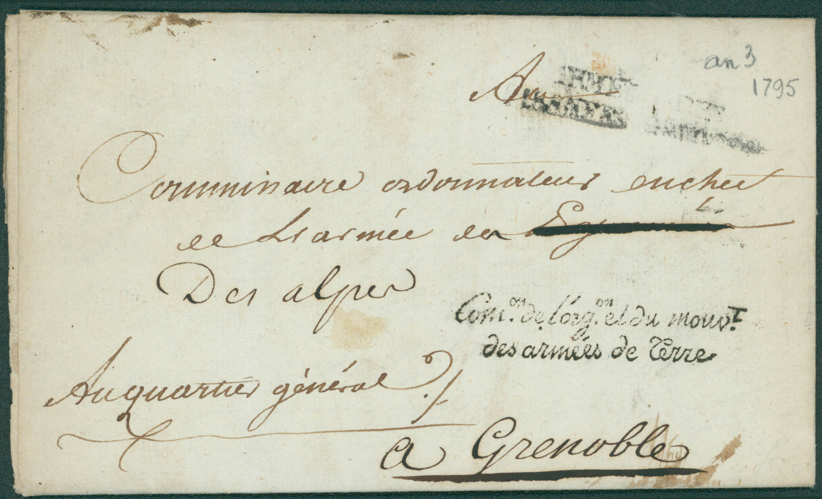 LAC illustrée à l'intérieur datée de Paris 14 vendémiaire an 3 (5/10/1794) vers le Commissaire Ordinateur de l'armée des Alpes. Griffe en noir 'Com.on de l'org.on et du mouv.t/des armées de Terre'. Seconde griffe peu lisible.'