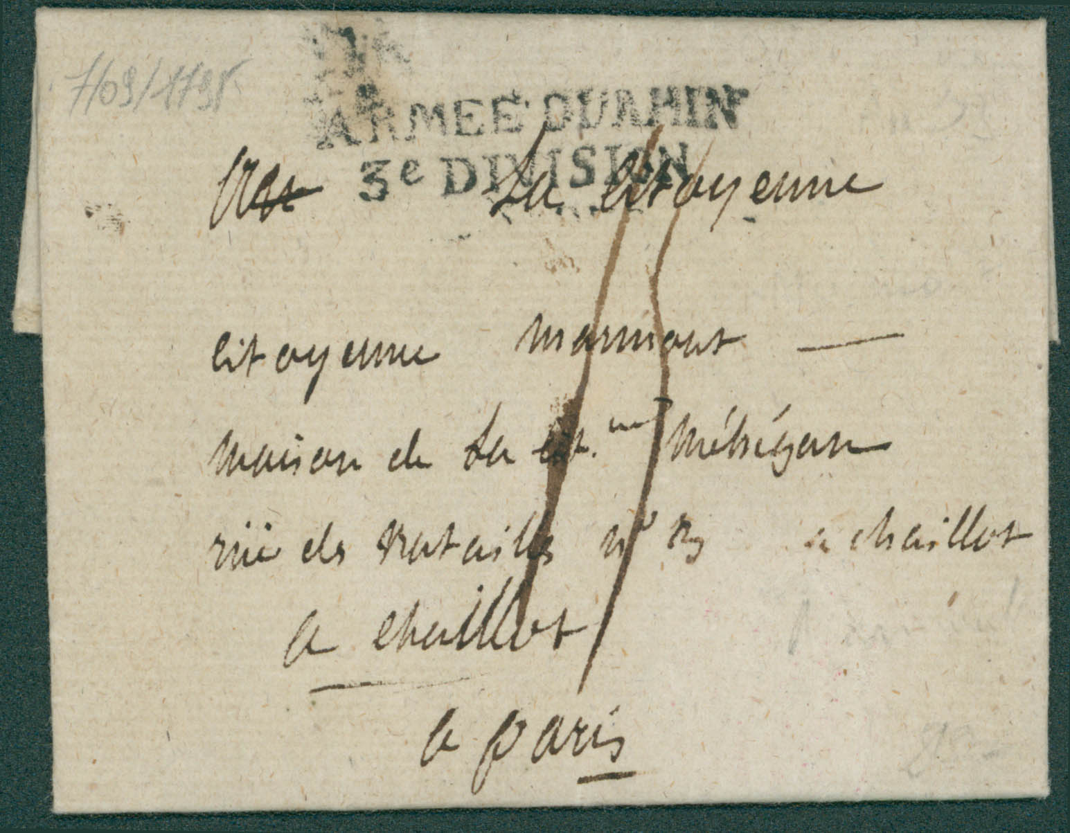 LAC datée 21 fructidor an 3 (7/9/1795), griffe en noir 'Armée du Rhin/3e Division' vers Paris + port.'