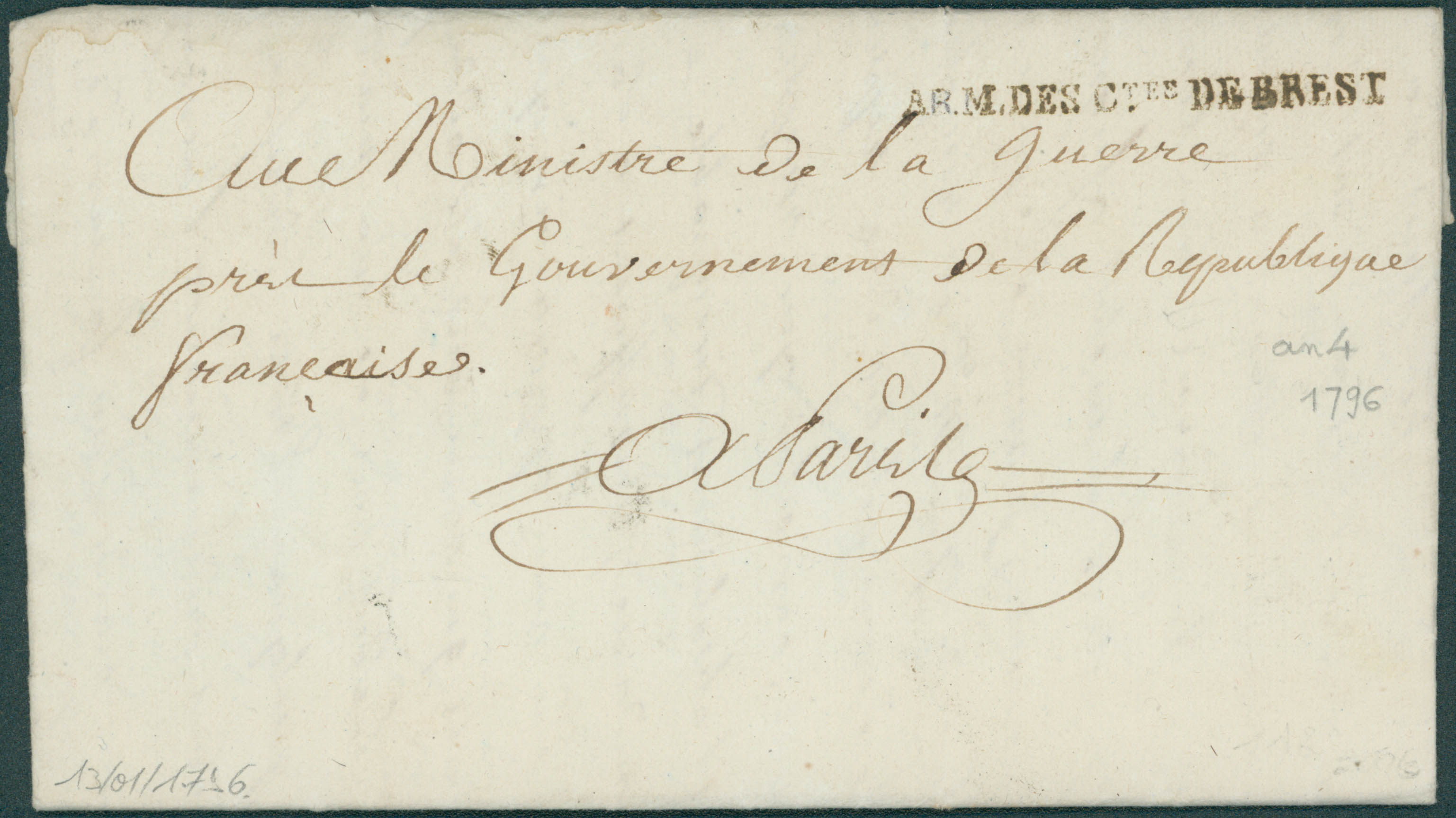 LAC datée de Fougères le 23 nivose an 4 (13/1/1796) de l'Armée des Cotes du Nord vers le Ministre de la guerre à Paris. Griffe en noir 'Arm. Des C.tes de Brest'. TB'