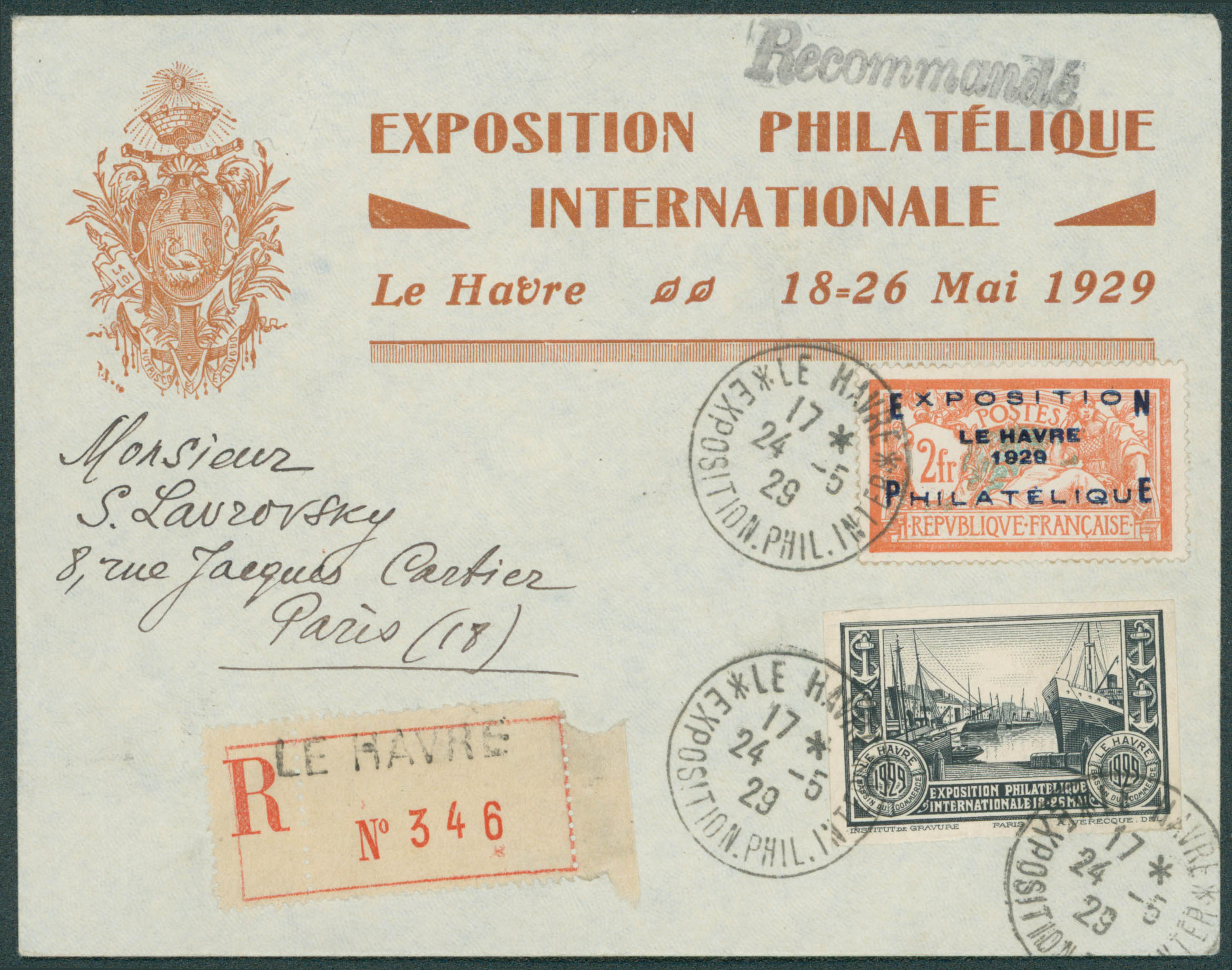 Env. officielle Exposition Philatélique Internationale Le Havre, afft Yv. 257A obl 24/5 + vignette en rec vers Paris, càd arrivée au verso.