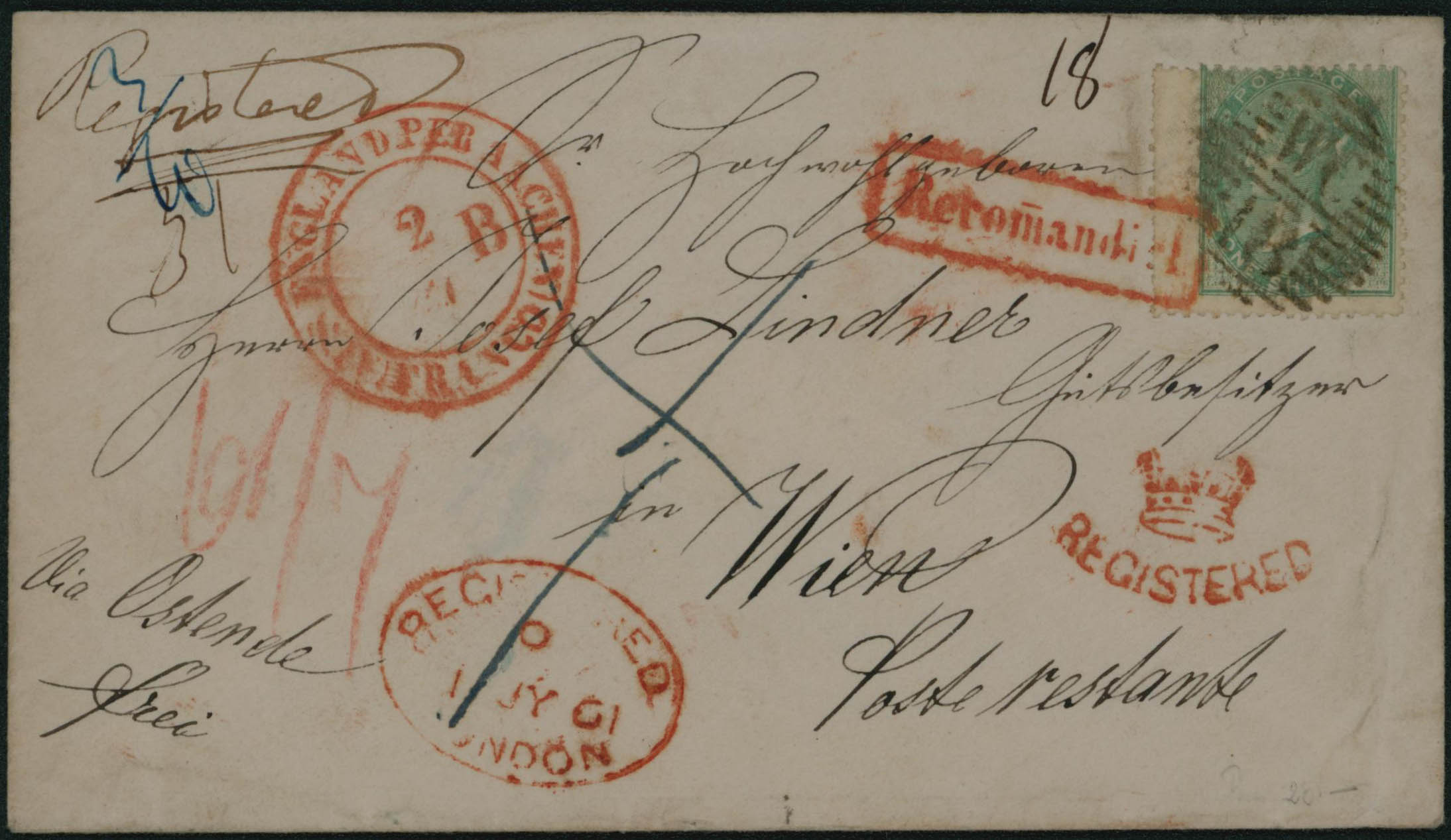 Yv. 20 (1sh vert) en rec de Londres via Ostende vers Vienne, poste restante. Griffes et cachets en rouge dont 'Aus England per Aachen/Franco'. TB'