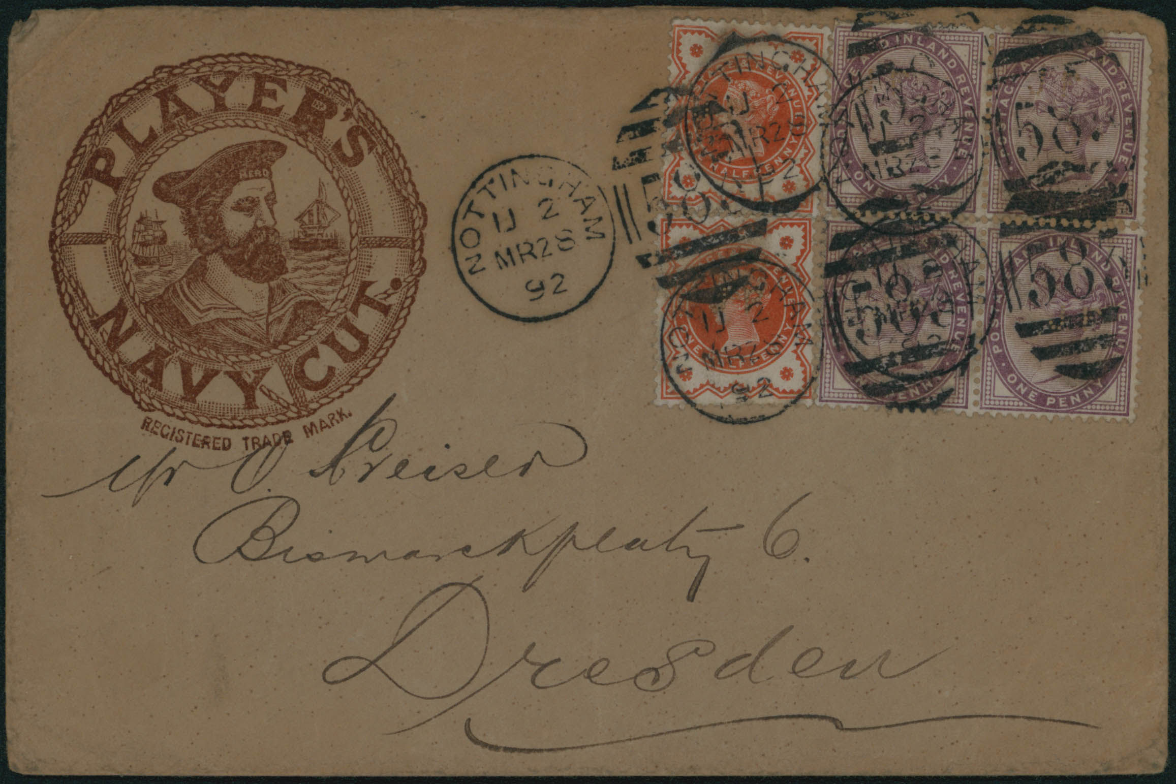 Yv. 73x4-91x2 obl Nottingham '58' sur enveloppe illustrée 'Player's/Navy Cut.' vers Dresden, Allemagne. Verso : 'John Player/Tobacco Manufacturer Nottinghem' et arrivée.'