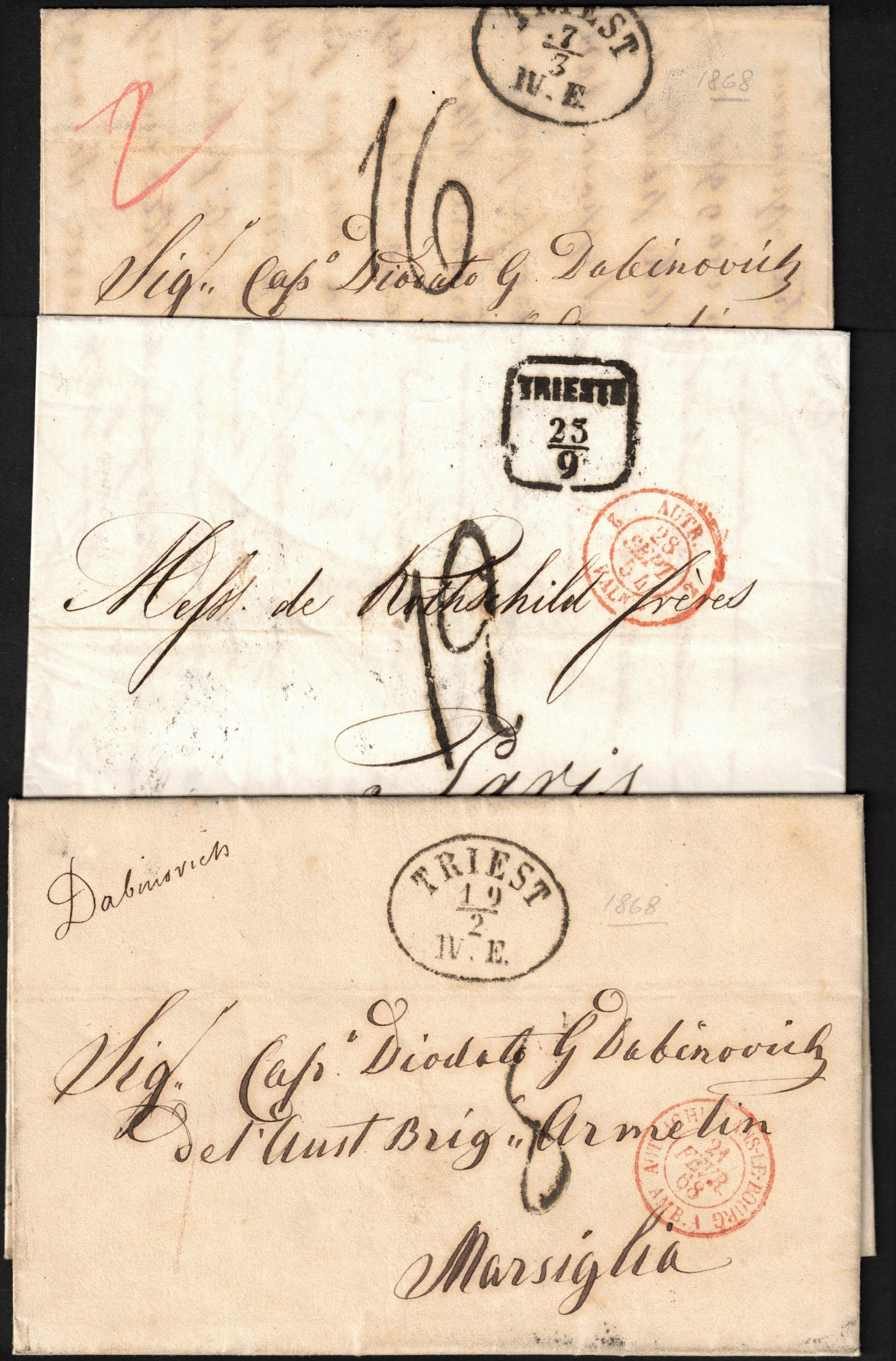 3 LAC de Trieste 23/8/1854, 19/2/1867 et 7/3/1888 vers Paris (port 12) et Marseille (ports 8 et 16). TB ensemble.