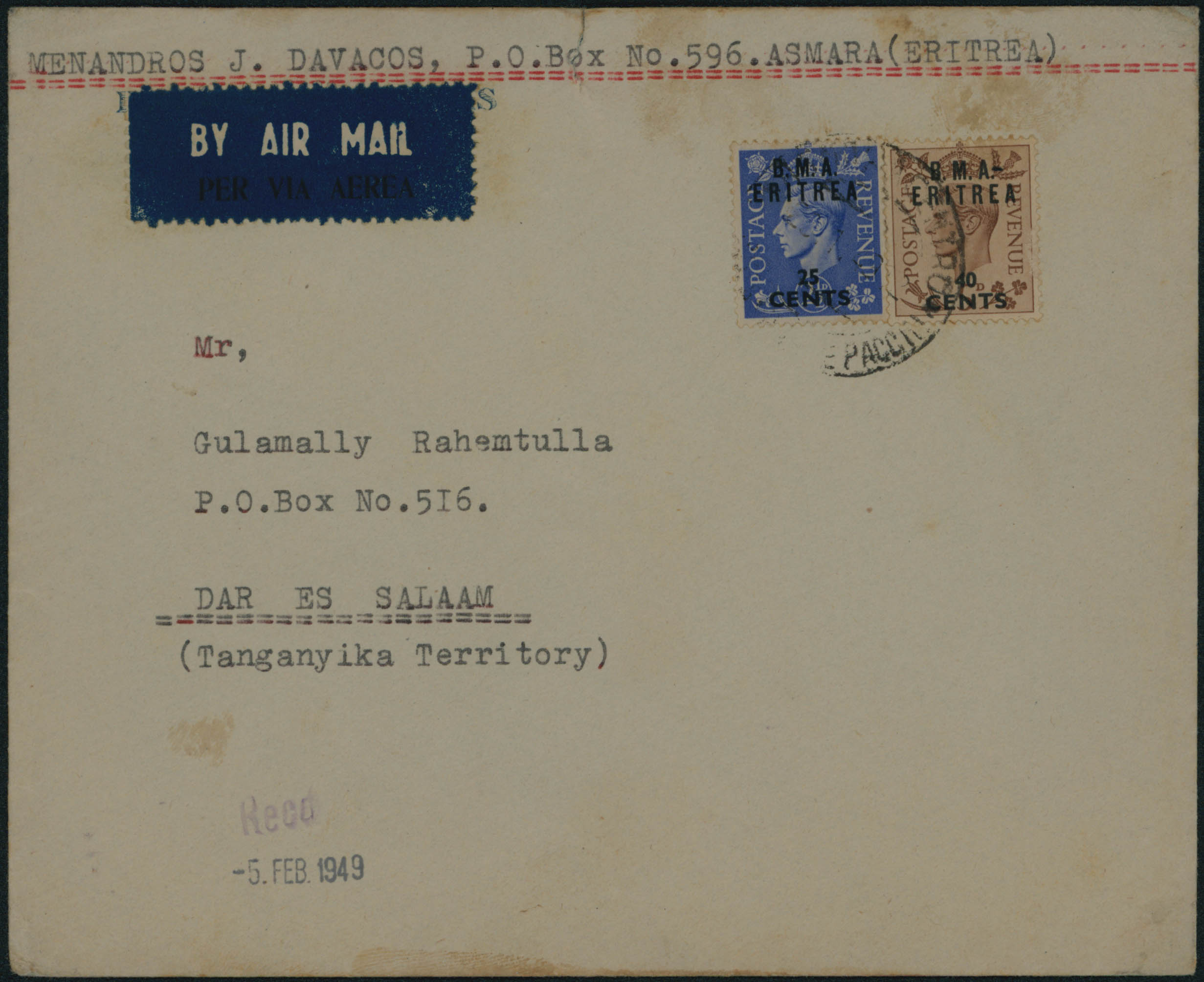 Erythrée - Sass. 4-6 obl Asmara en PA le 5/2/1949 vers Dar Es Salaam.