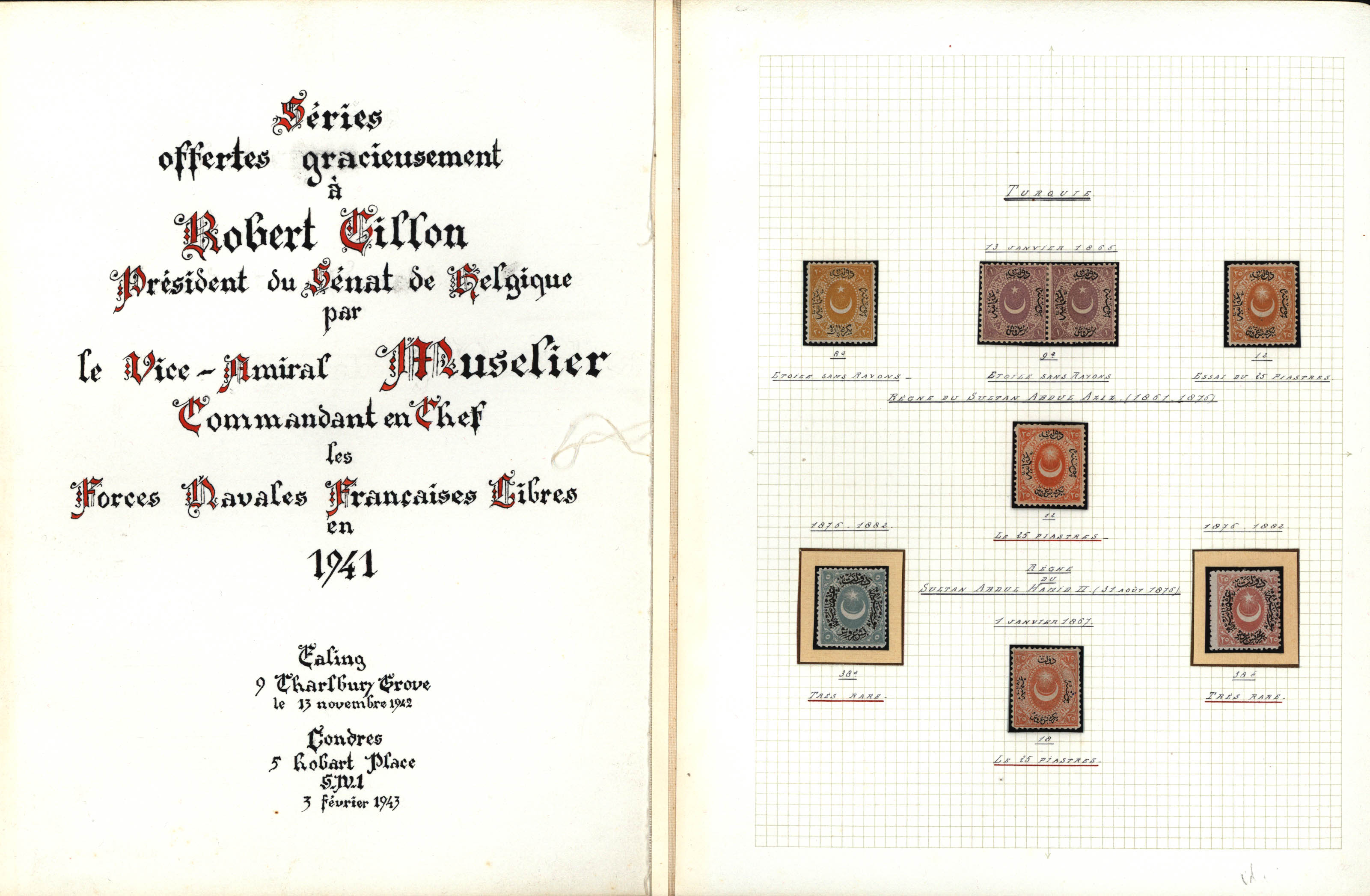 Séries offertes gracieusement à Robert Gillon Président du Sénat de Belgique par le Vice-Amiral Muselier Commandant en Chef les Forces Navales Françaises Libres en 1941. Ensemble de timbres anciens obl ou X entre 1865 et 1890, 44 timbres, 1 EP et 2 essais. Oblitérations rares, bonnes valeurs SG 31a, 38a, 38b, demi-timbres........ Cote indicative 5000?. Superbe ensemble rare.