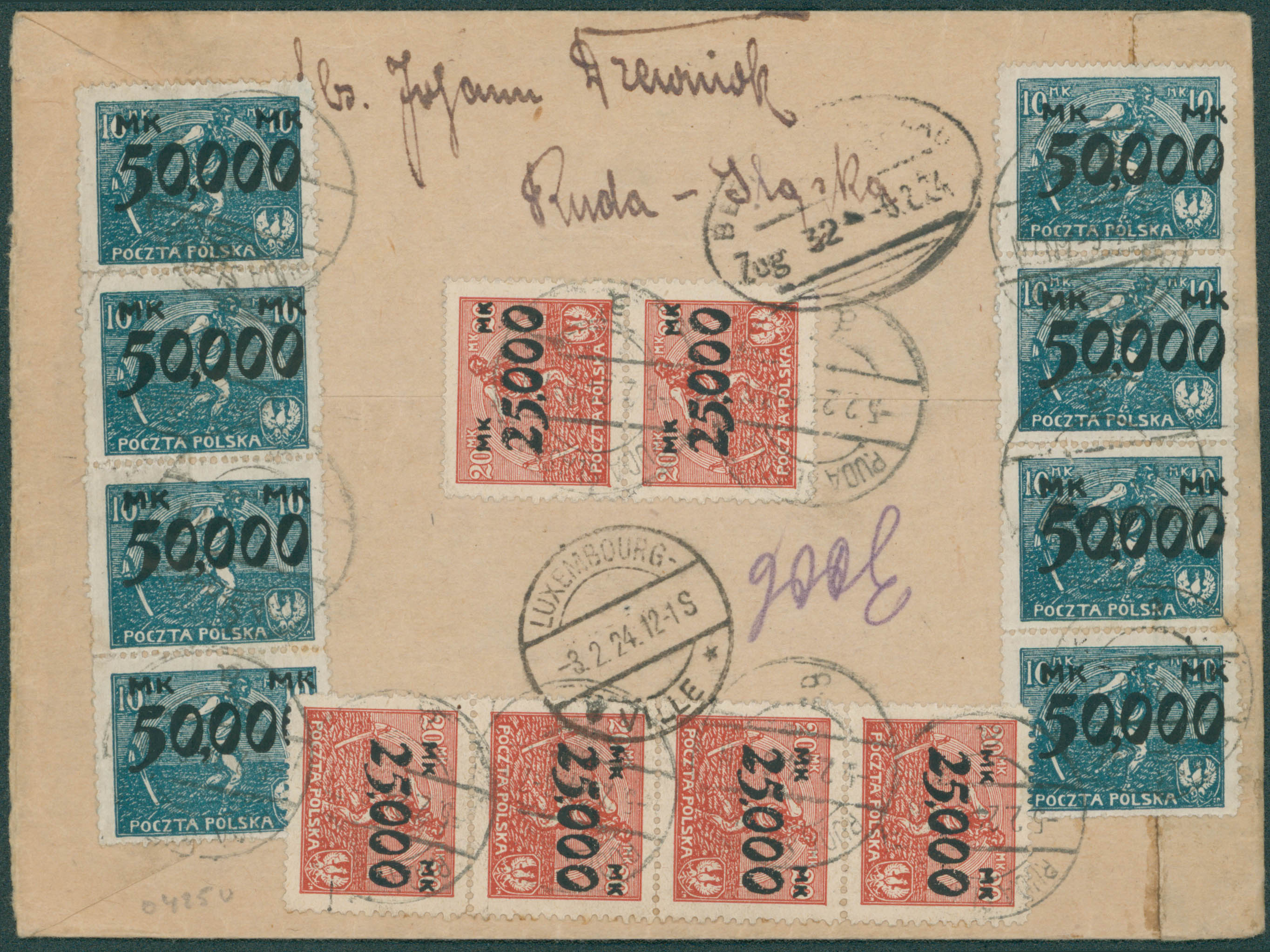 Pologne - Inflation - Yv. 274-276x6 + verso 274x8-276x6 rec. Ruda Slaska vers le Luxembourg, càd arrivée verso 3/2/24.