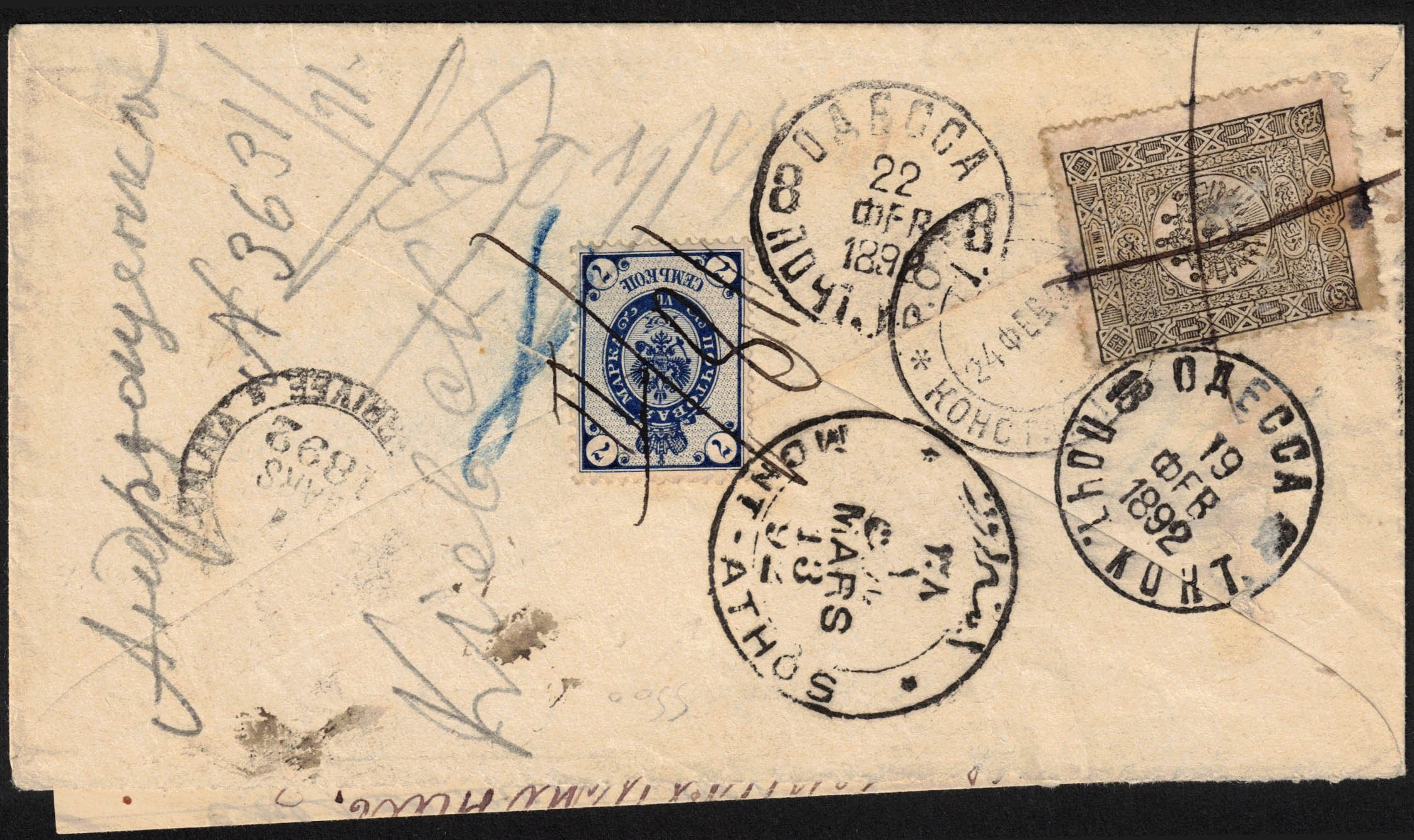 Russie - Yv. 32 au verso annulation manuscrite sur env + contenu, càd Osessa 19/2 vers la Turquie, càd Mont-Athos 13/3, taxe 1p par Yv. 85 annulée par 2 traits à l'encre. TB et rare.