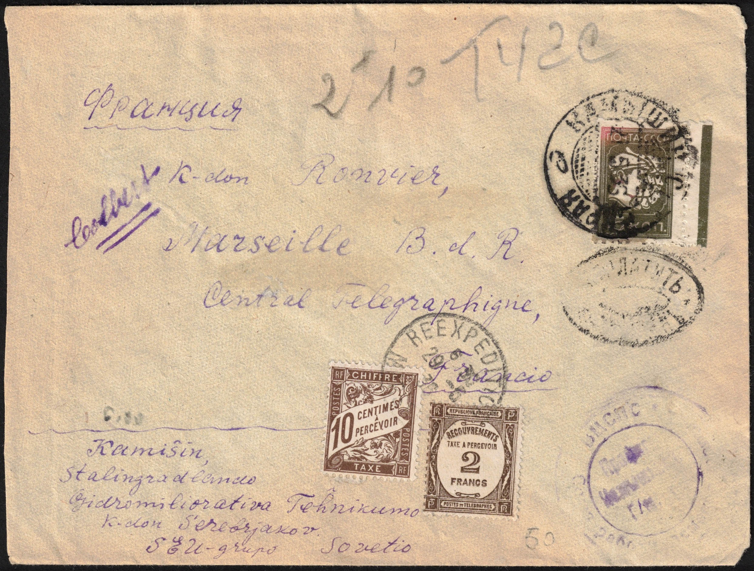 Russie - Yv. 427 obl Kamisin Stalingrad vers la France. Censure. Taxation 2F10 à Marseille le 29/5/1936. TB