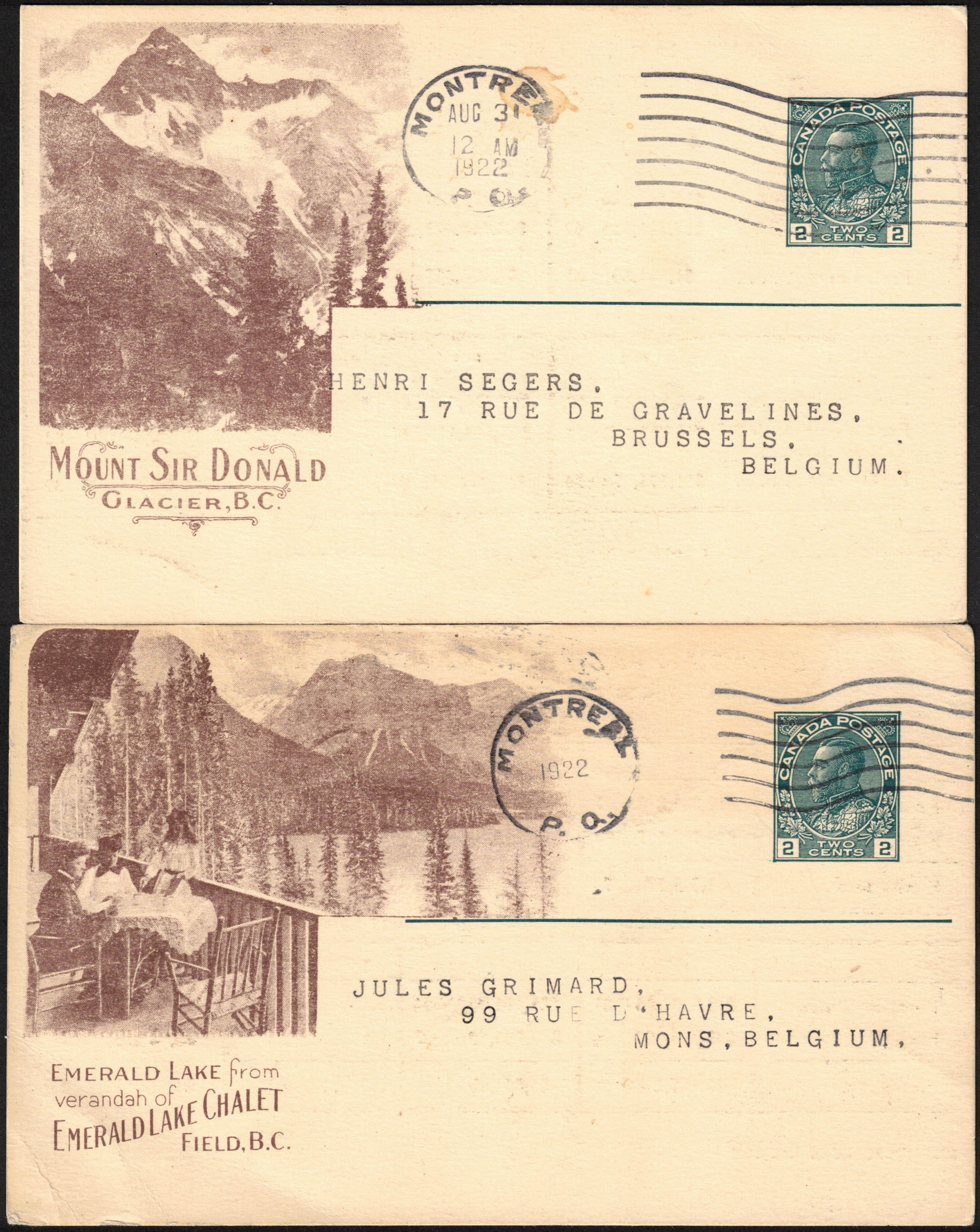 4 EP de 2c oblitérés illustrés, publicités différentes (glacier, hôtel, chalet, château), vers la Belgique. Repiquage au verso 'Canadian Pacific Railway Company'.'