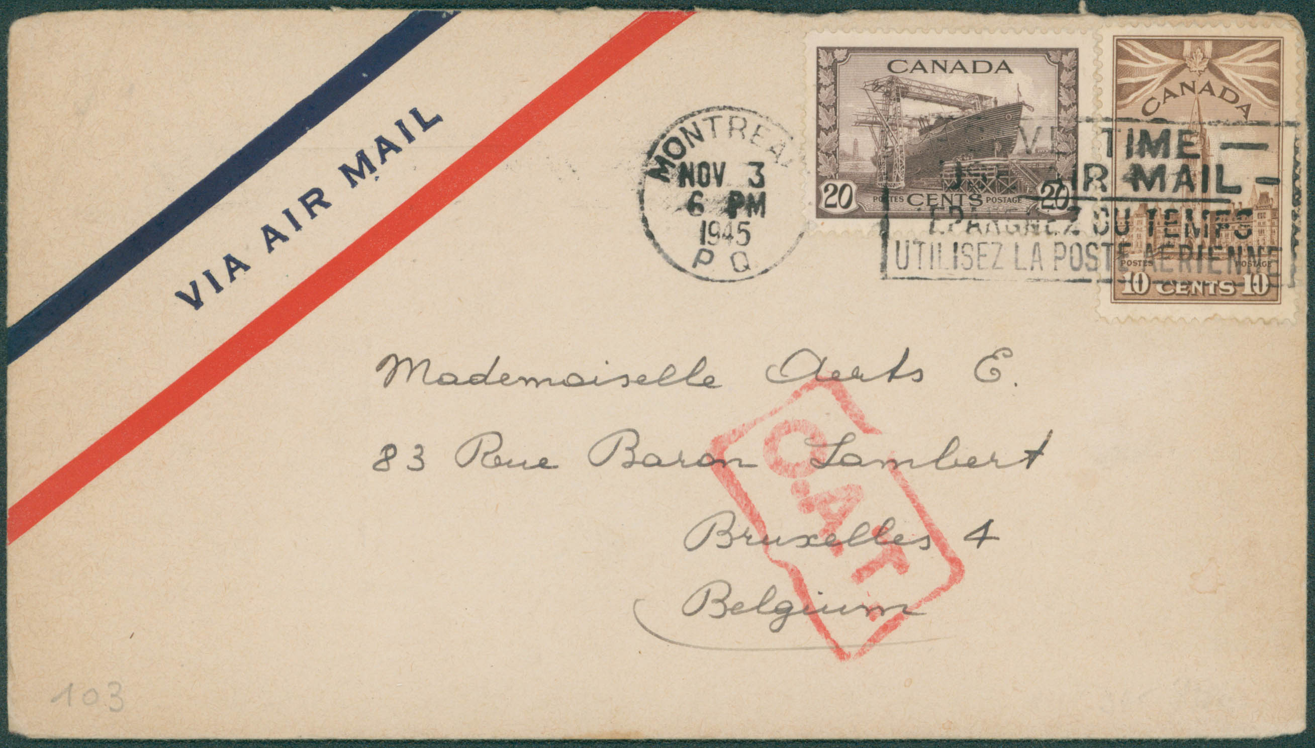 Yv. 213-216 obl Montréal 3/11/45 en PA vers Bruxelles. Griffe encadrée en rouge 'O.A.T.''