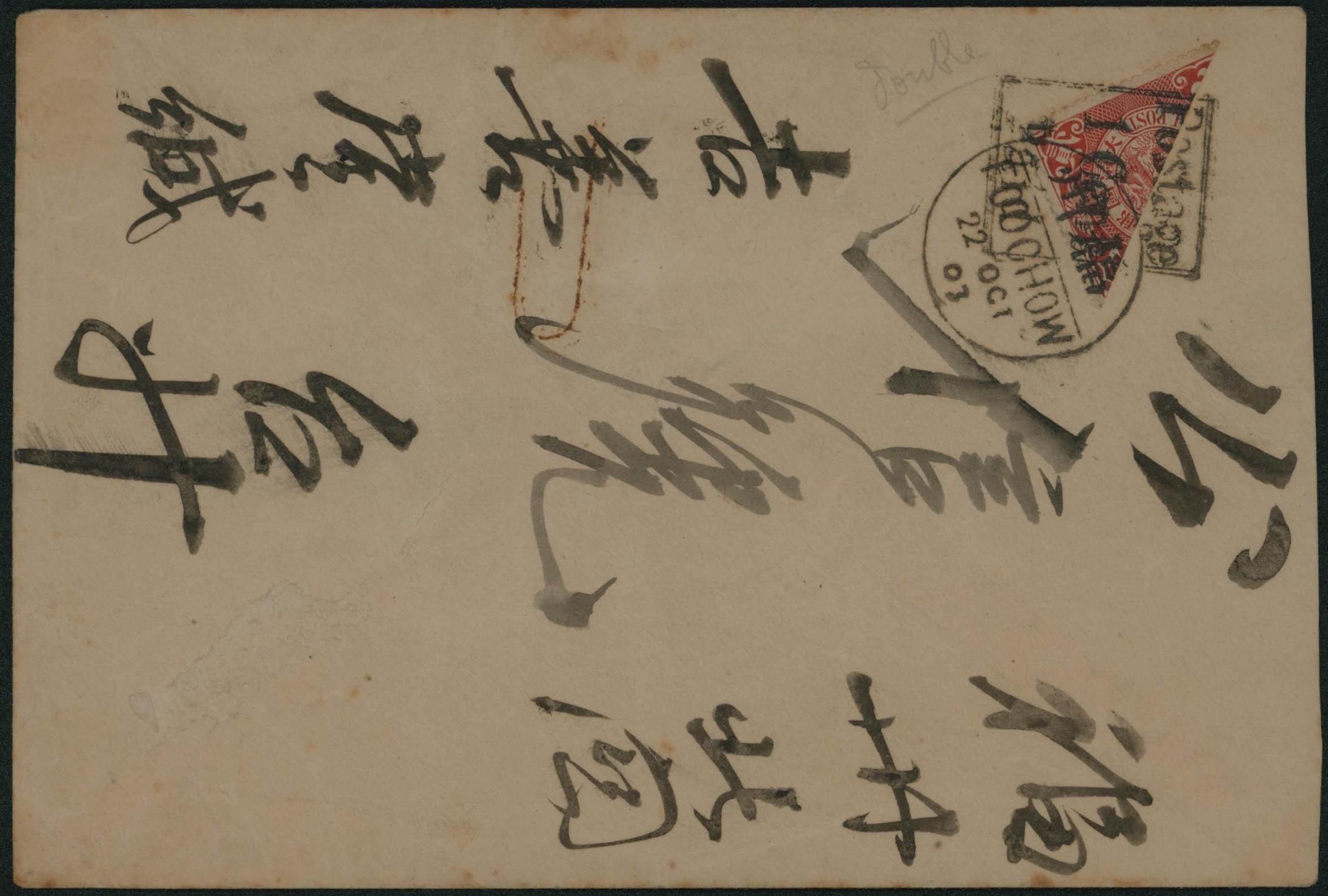 Yv. 74 - 1/2 timbre, càd Postage 1 Cent Paid sur 2c rouge carminé (Yv. 48) - obl Foochow 22/10/03 sur env en service intérieur. Rare.