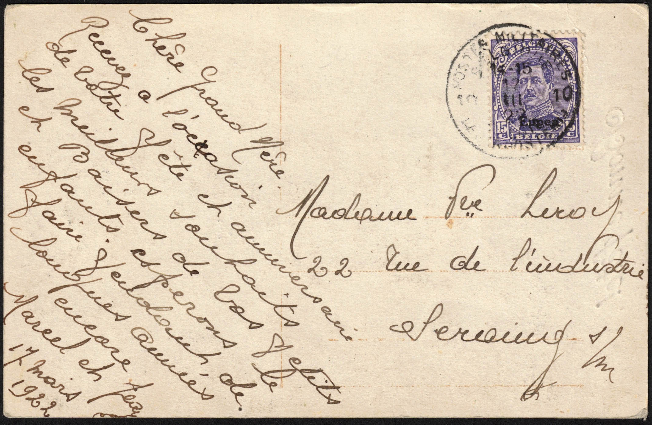 OC 57 (surcharge Eupen) obl PMB 10 du 17/3/1922 sur CP vers Seraing.