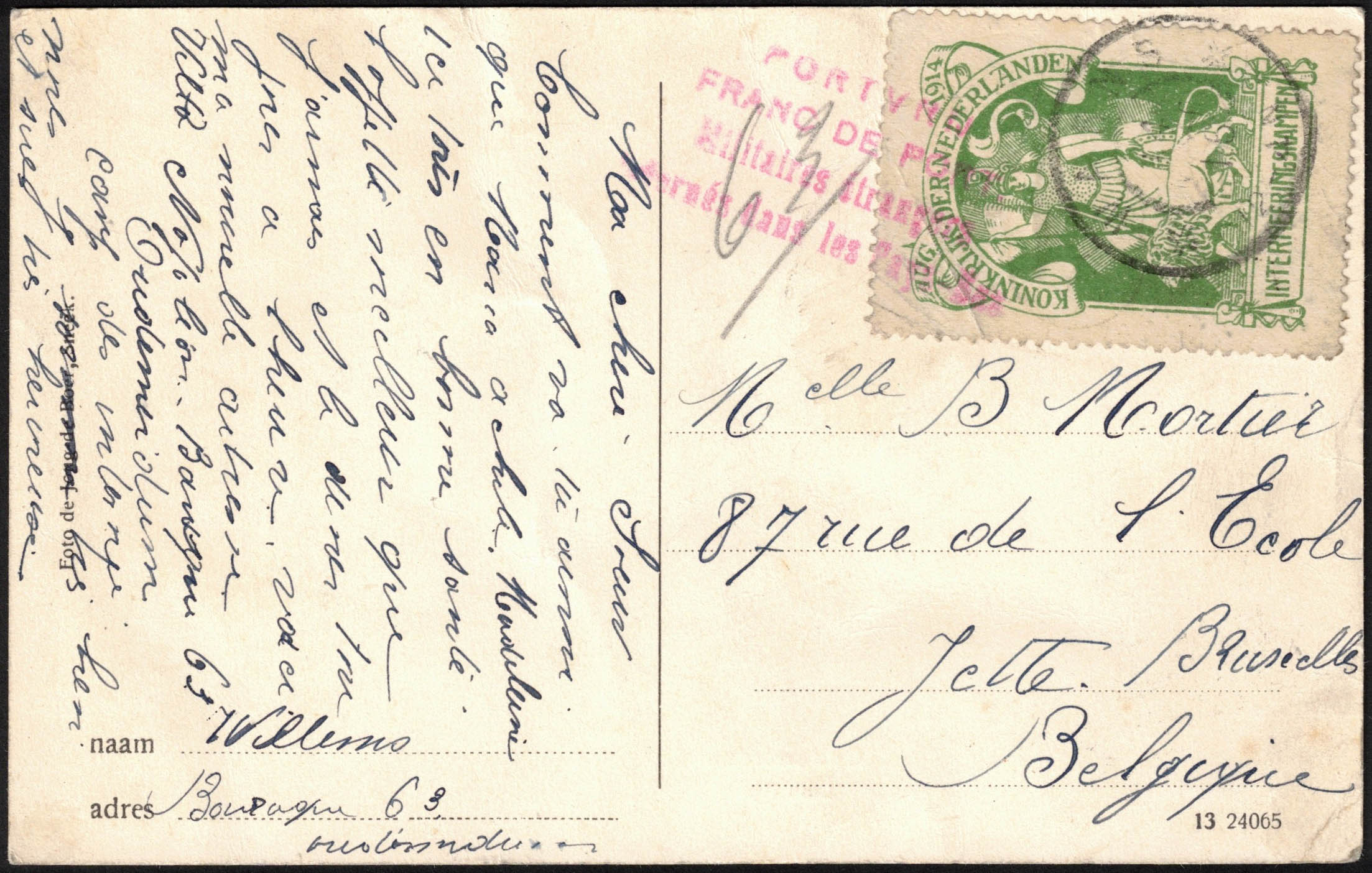 CP avec vignette camps des Internés de Oudemirdum vers Jette en Belgique. Griffe en rouge 'Franc de port/Militaires étrangers internés dans les Pays-Bas'. TB'