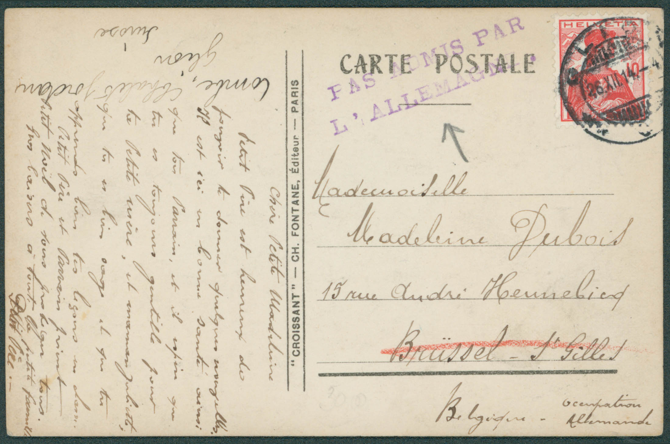 Suisse - Yv. 131 obl Glion 26/XII/14 sur CP vers Bruxelles. Griffe en violet 'Pas admis par l'Allemagne'. TB'